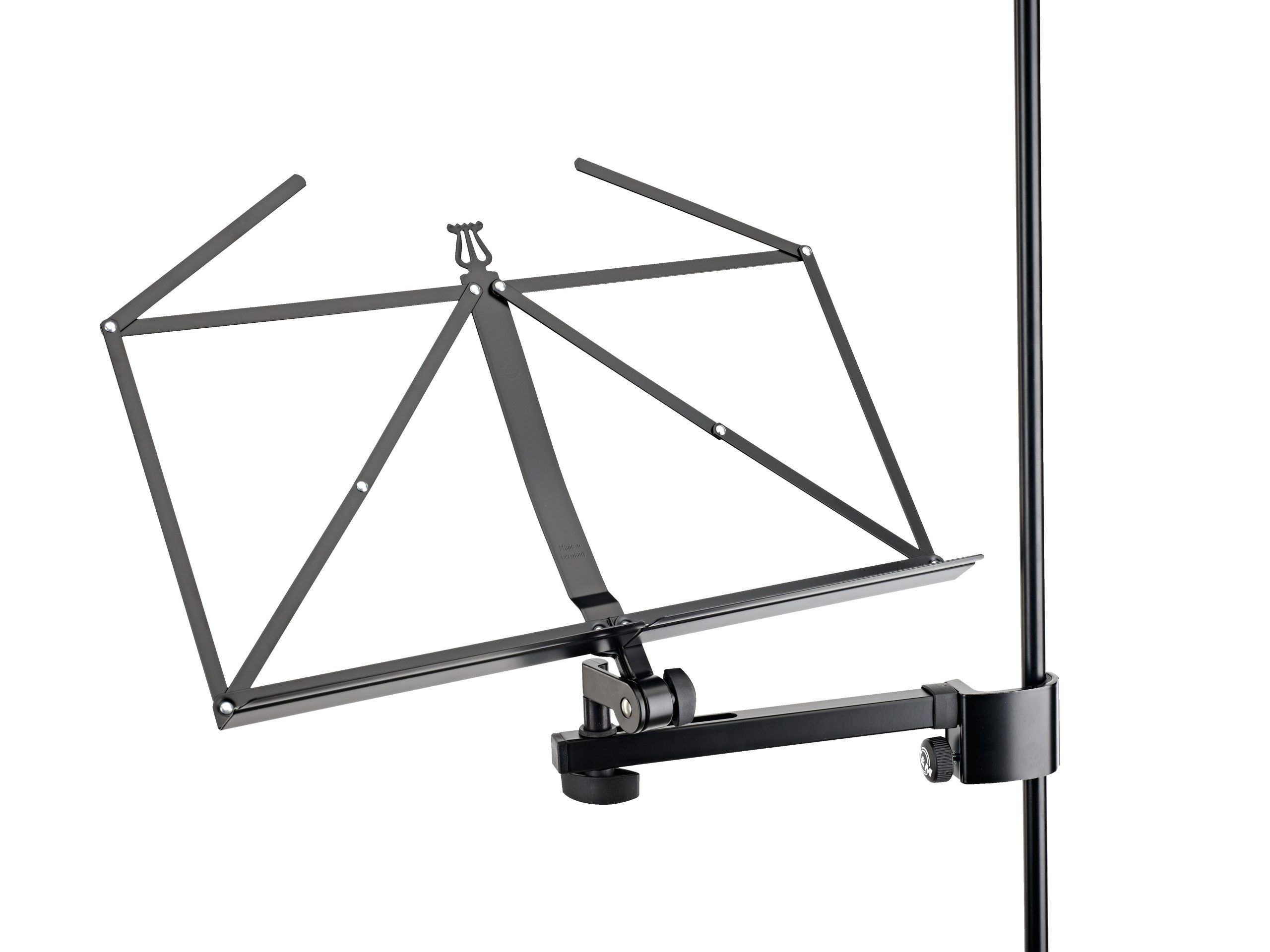 Großer faltbarer Notenpultkopf mit Auslegerarm aus Stahl zum Anschrauben an senkrechte Stativrohre. Der Klemmbereich für die Rohre liegt zwischen ø 11 und ø 30 mm. Der Notenpultkopf kann zudem im Abstand zum Stativrohr stufenlos zwischen 185 und 265 mm auf dem Auslegerarm positioniert werden. Die Klemmung und Ausrichtung des Notenpultkopfes erfolgen mittels einer handlichen Flügelschraube. Für den Transport kann der Notenpultkopf platzsparend zusammengelegt und eingeklappt werden.