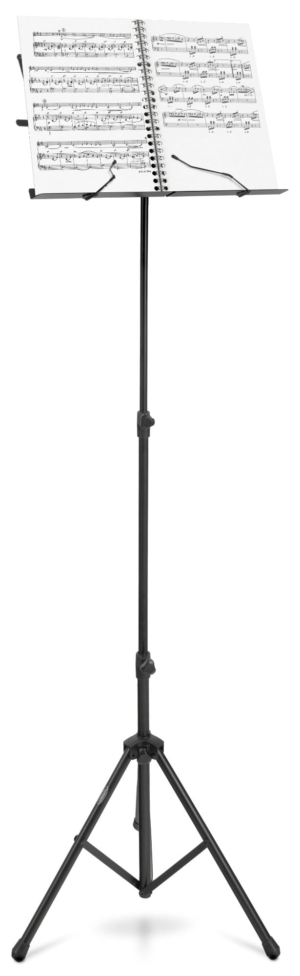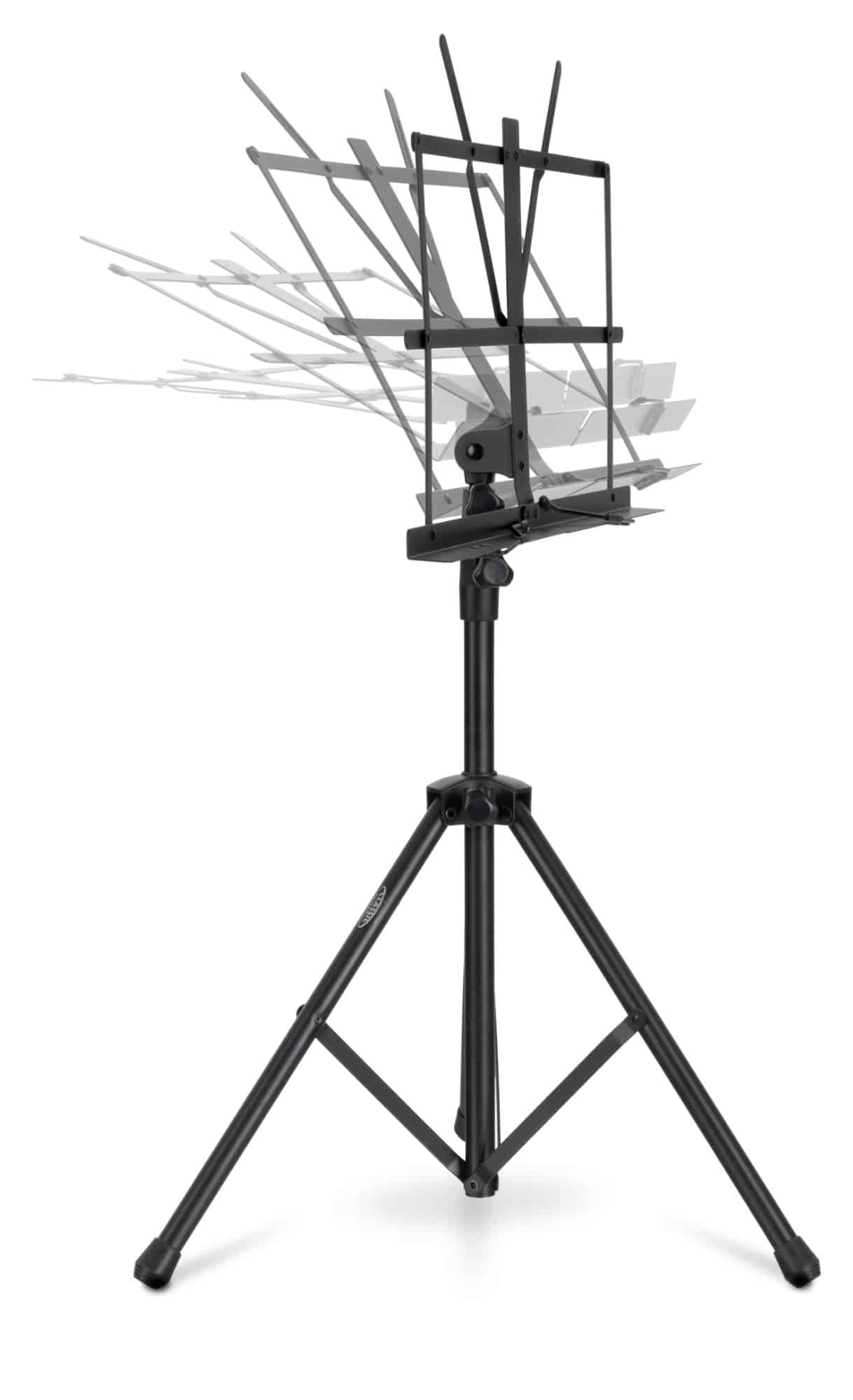 Die stufenlos verstellbare Ablage verfügt über eine Breite von 50 cm und eine Tiefe von 2,5 cm, wodurch auch umfangreiches Notenmaterial ausreichen Platz findet. Zwei federnd gelagerte Notenklemmen hindern bei Bedarf die Noten vor versehentlichem Umblättern. Da der Ständer aus Stahl ist, steht auch dem Einsatz von Magneten nichts im Wege.