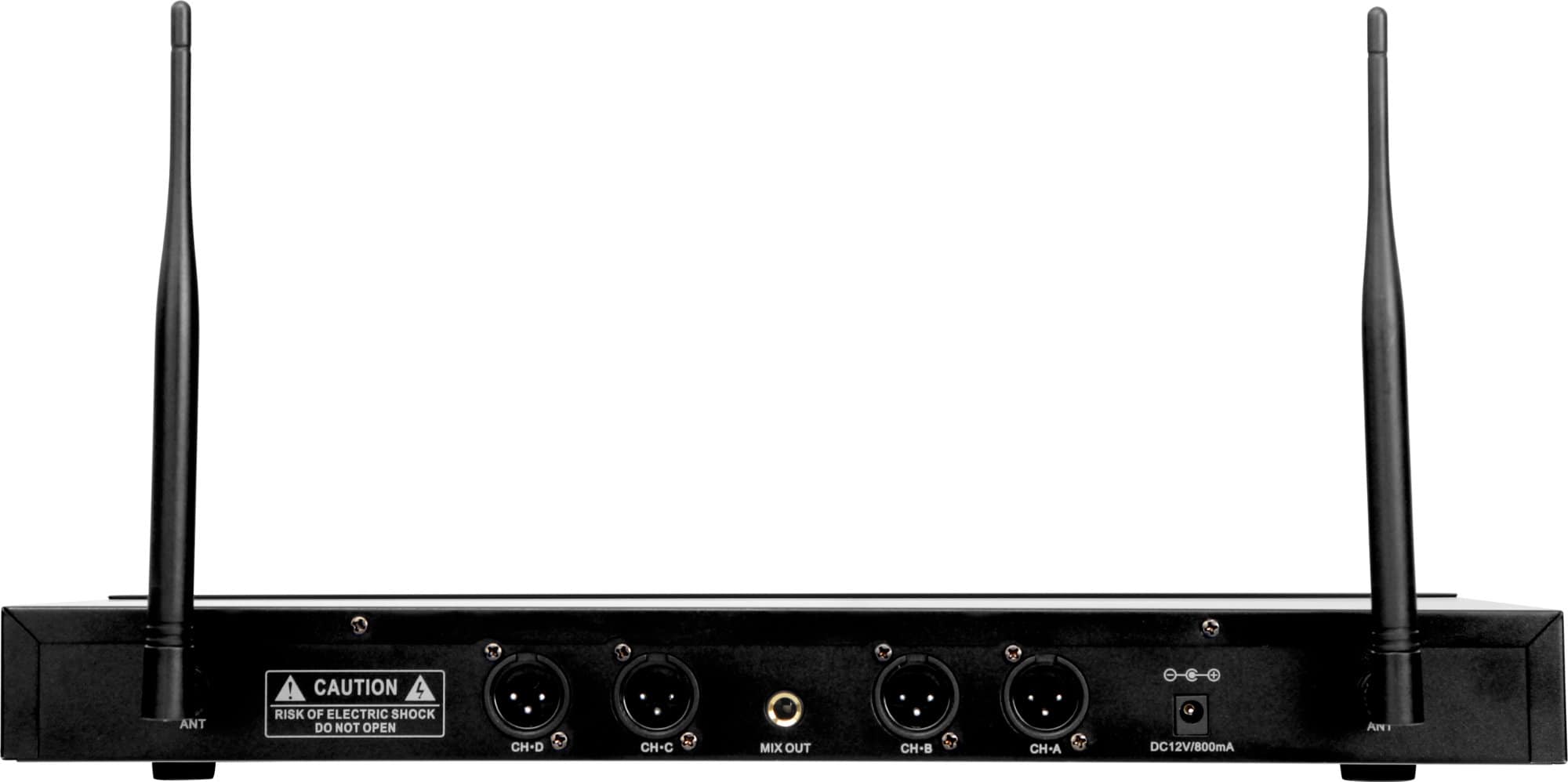 Der kompakte Drahtlos-Empfänger verfügt über eine gut lesbare Anzeige für alle 4 Kanäle und einen Lautstärkeregler, welcher komfortabel auf der Vorderseite angebracht ist. So kann die Lautstärke der Mikrofone direkt von der Bühne aus gesteuert werden und muss nicht umständlich über das Mischpult geregelt werden. Desweiteren verfügt der Receiver über 2 Kontroll-LEDs für die Verbindungskontrolle und zum Vermeiden von ungewollten Übersteuerungen. Durch die beiden extralangen Antennen können Funkstörungen wirkungsvoll verhindert werden.