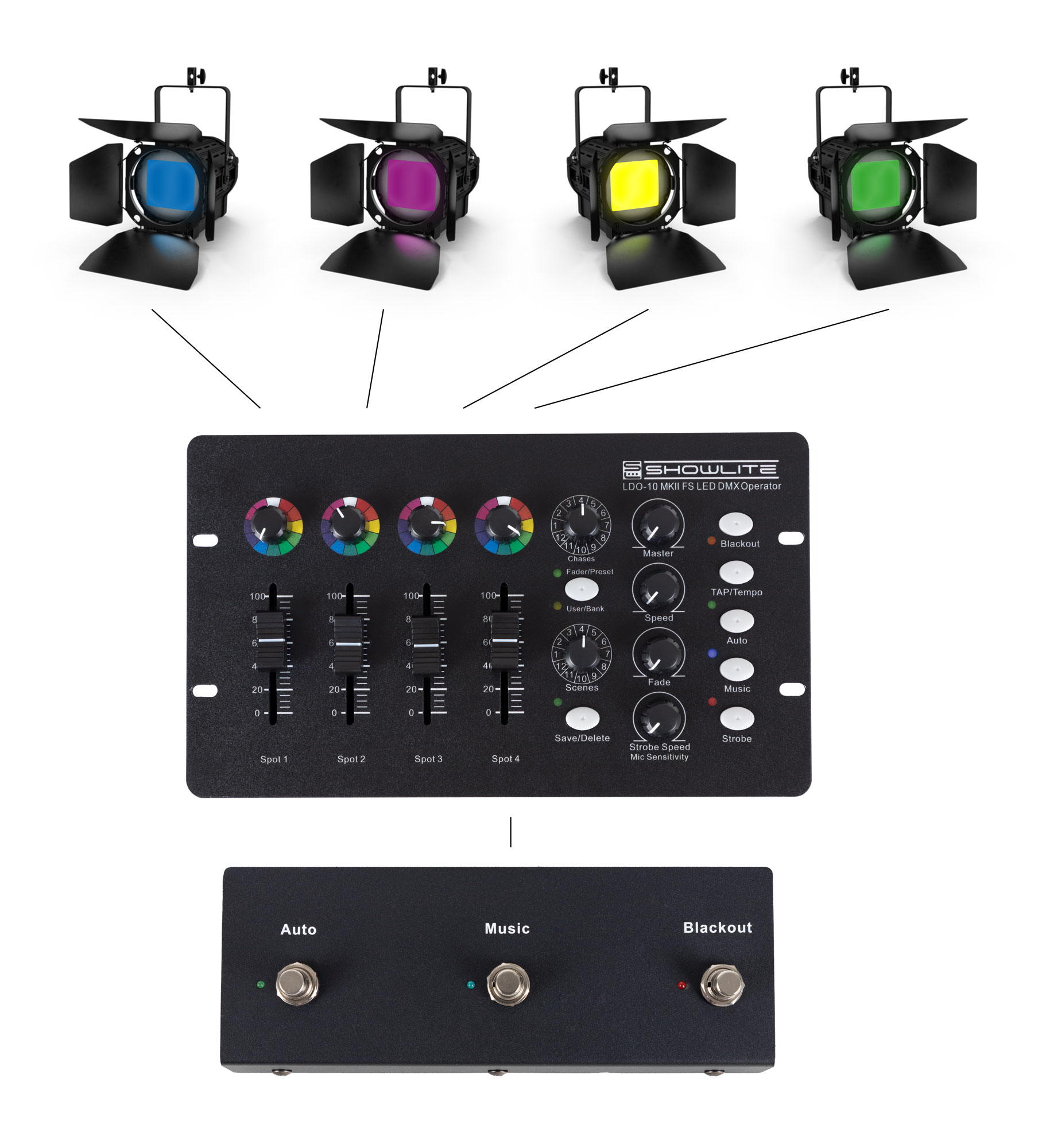 Der Showlite LDO-10 MKII FS DMX Operator ist für bis zu 4 DMX LED Scheinwerfer vorprogrammiert. Natürlich kann man auch 8 oder mehr Scheinwerfer benutzen und diese einfach in Vierer-Gruppen aufteilen. Somit ist die gängige Standardlösung für mittlere Bands mit je 4 Scheinwerfern links und rechts optimal gelöst.