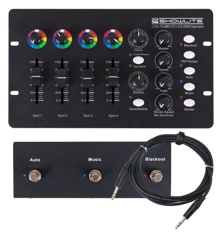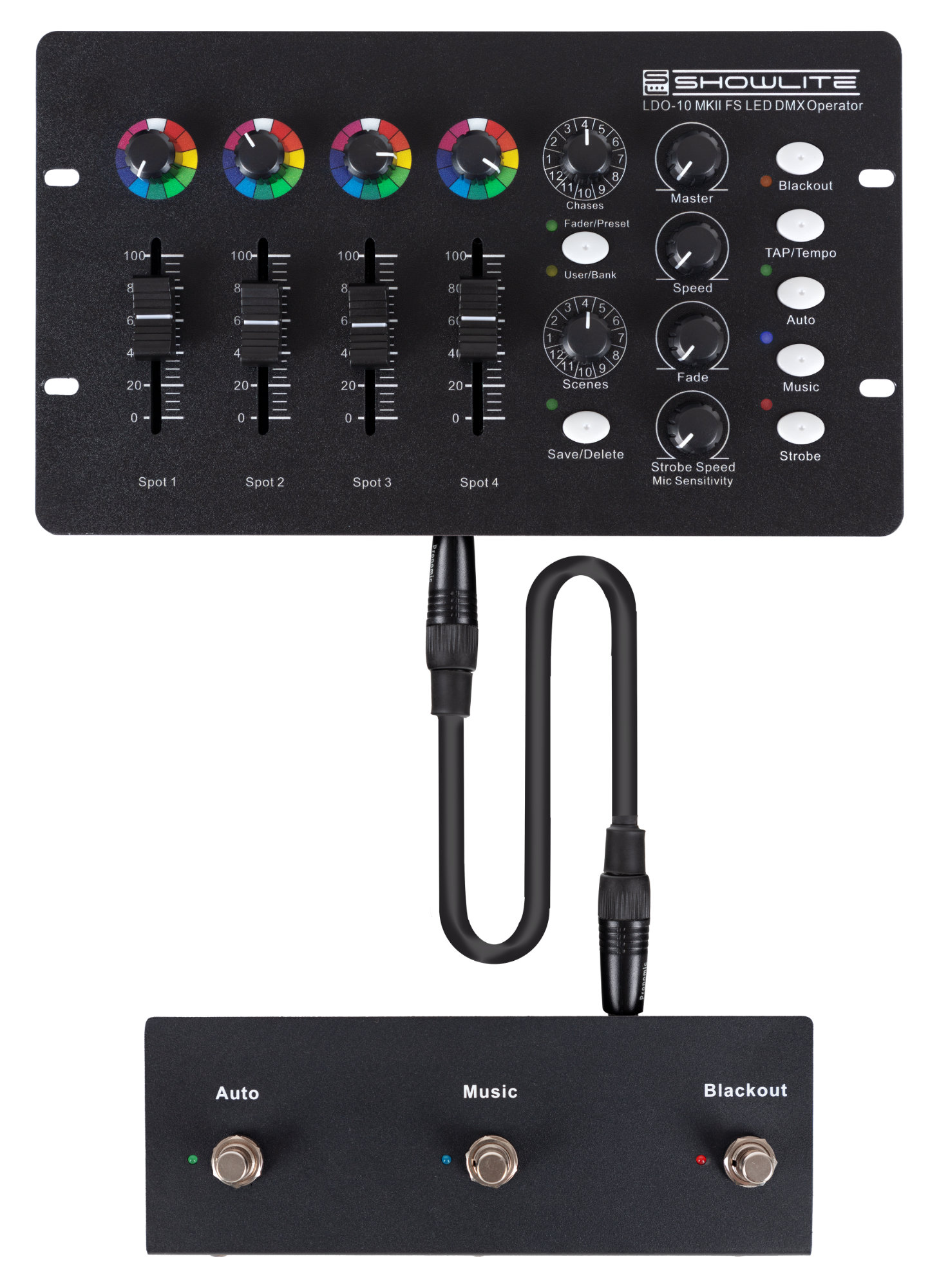Der Showlite LDO-10 MKII FS DMX Operator sorgt für kinderleichte Steuerung von LED-Scheinwerfern auf kleinen Bühnen, Events oder Clubs. Über das kompakte Mischpult lassen sich 4 unterschiedliche Scheinwerfer oder Scheinwerfergruppen direkt und unkompliziert steuern – manuell oder mit Fußschalter. Dabei ist es mit dem LDO-10 MKII FS möglich, einzelne Farben über spezielle Farbdrehregler mit 12 unterschiedlichen Farben und dem jeweiligen Helligkeitsschiebregler einzustellen. Insbesondere Alleinunterhalter, Solomusiker und kleinere Bands profitieren von dem simpel zu bedienenden Lichtmischpult, da kein Lichttechniker mehr erforderlich ist.