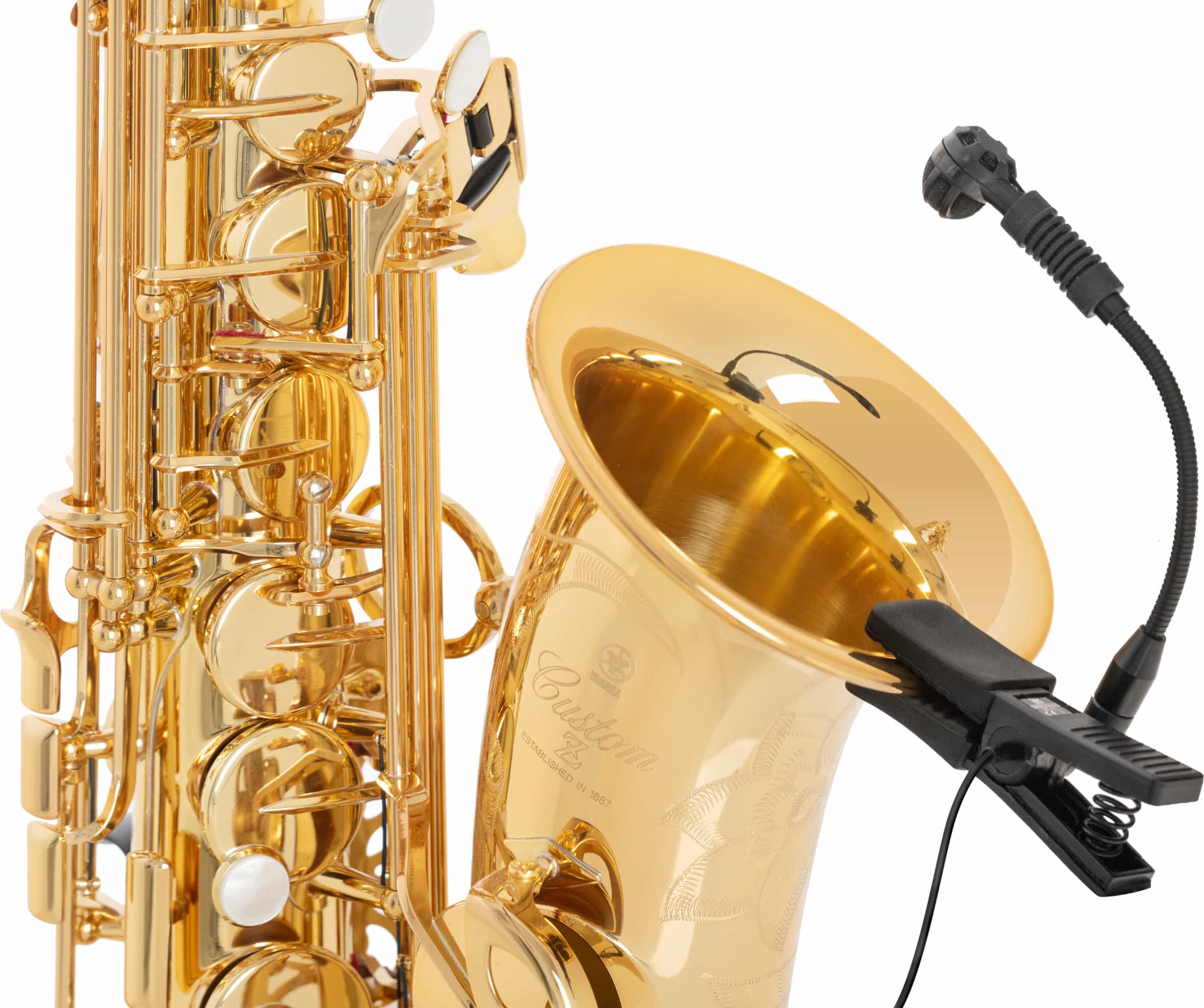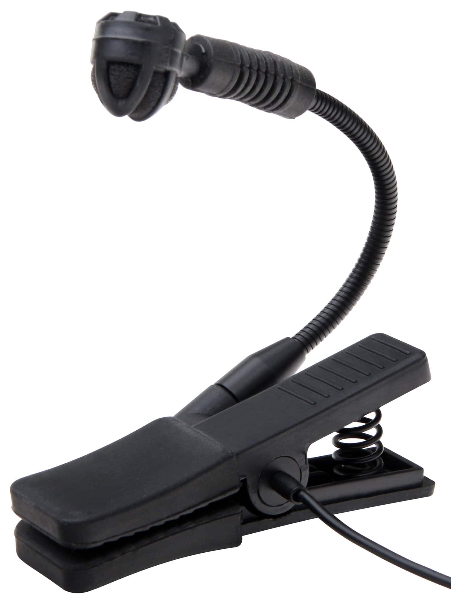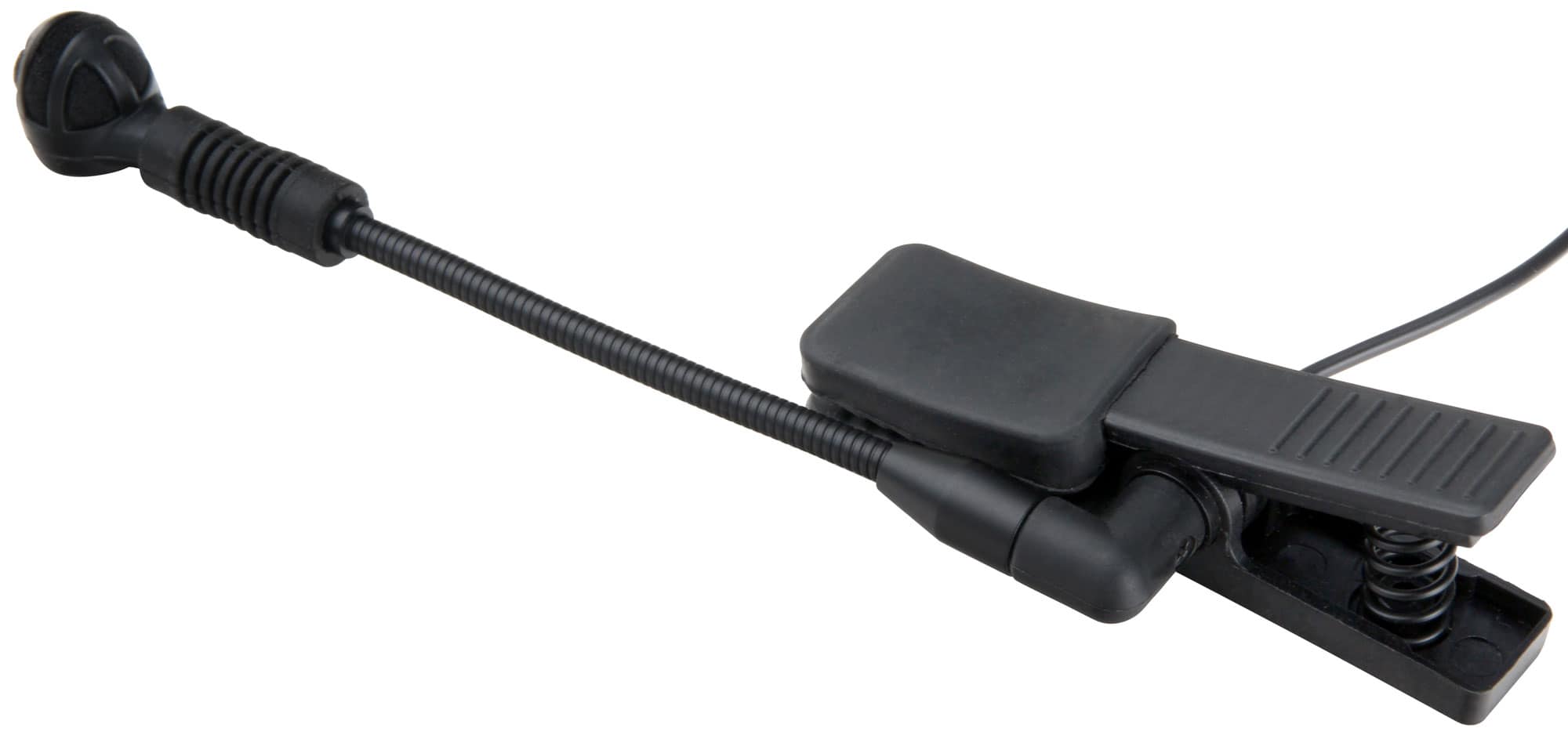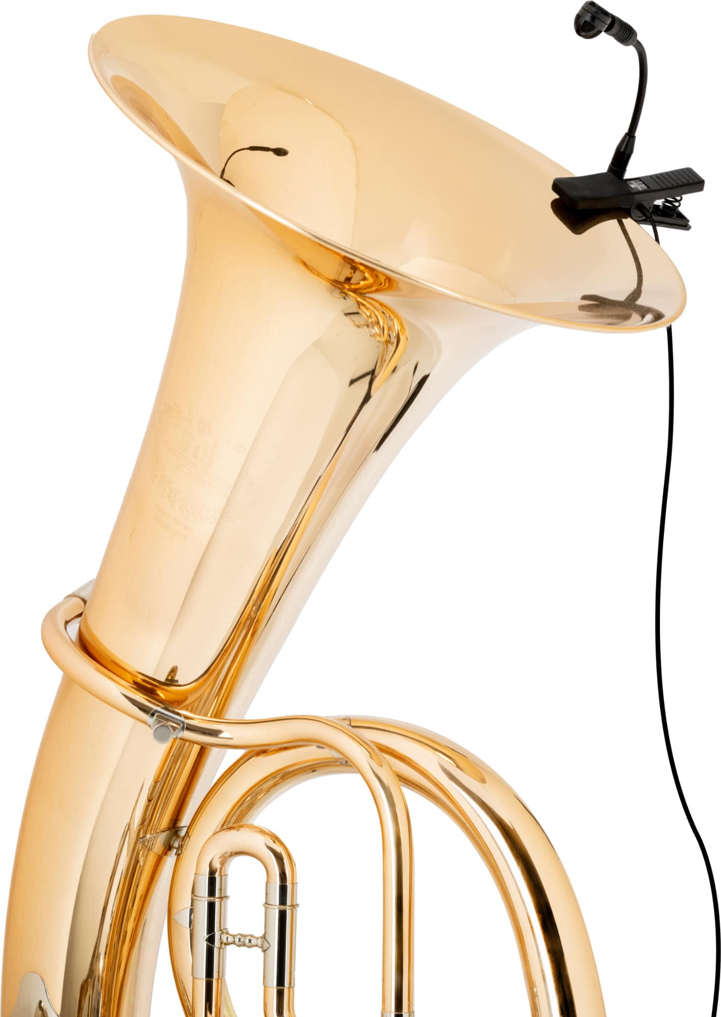 Das Clip-Mikrofon wird einfach auf den Rand des Schallbechers geklemmt und die Kapsel mit dem beweglichen Schwanenhals in die gewünschte Position gebracht. Die Klangfarbe kann somit je nach Positionierung variiert werden. Die Gummibeschichtung der Klemme verhindert ein Verkratzen des Instrumentes.