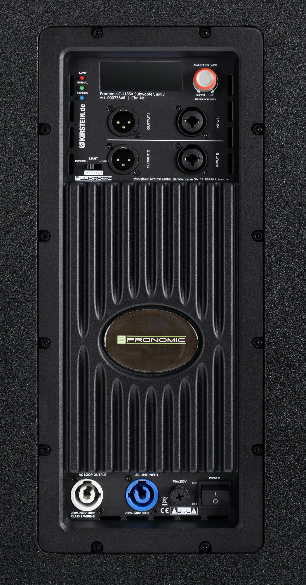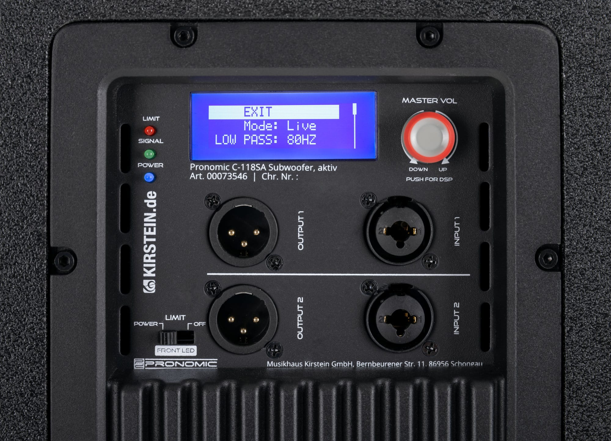 Der Subwoofer hat zwei Line-Eingänge im Combo-Format, für die Weiterleitung des Signals kommen zwei XLR-Ausgänge zum Einsatz. Mit Hilfe des Drehreglers und des Displays können alle wichtigen Einstellungen intuitiv vorgenommen werden. Die LED an der Vorderseite zeigt wahlweise an, ob Strom anliegt (blau) oder ob der interne Limiter eingreift (rot). Alternativ kann die LED auch komplett ausgeschaltet werden.