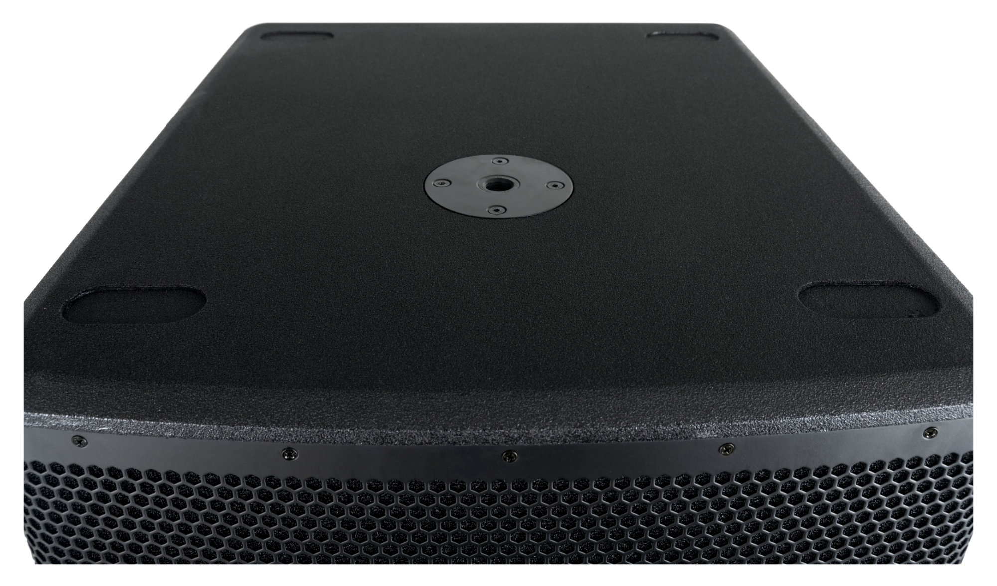 Die stabilen MDF-Platten mit 15 mm Stärke sind mit unempfindlichem Strukturlack versehen. An beiden Seiten befinden sich großzügige Griffschalen. Wie es sich im Profibereich gehört, besitzt der Boxenflansch für eventuelle Satelliten-Lautsprecher ein M20-Gewinde.