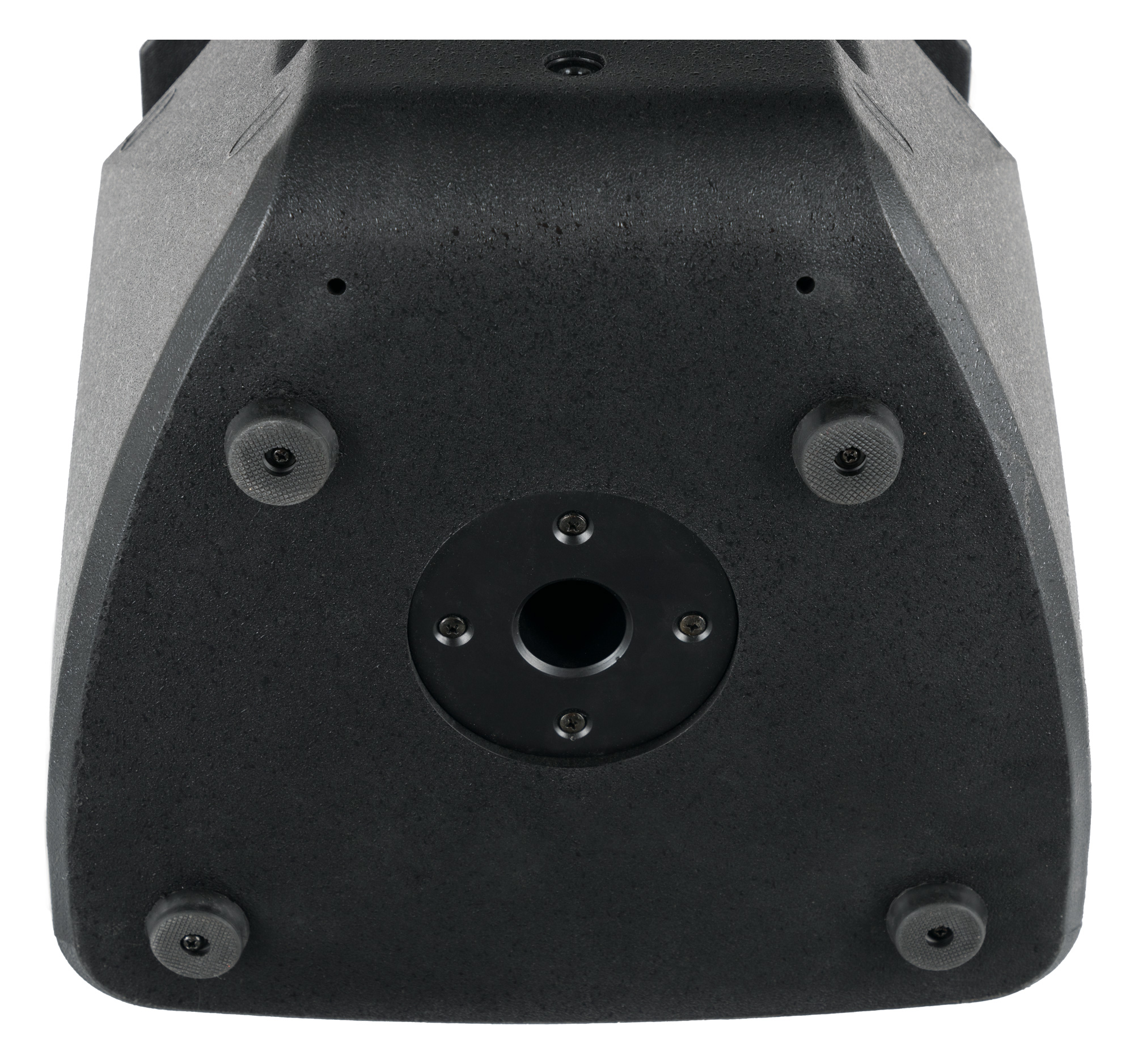 Die stabilen MDF-Platten mit 15 mm Stärke sind mit unempfindlichem Strukturlack versehen. An beiden Seiten befinden sich großzügige Griffschalen aus Metall. Natürlich ist auch der Boxenflansch für eventuelle Satelliten-Lautsprecher aus Stahl.
