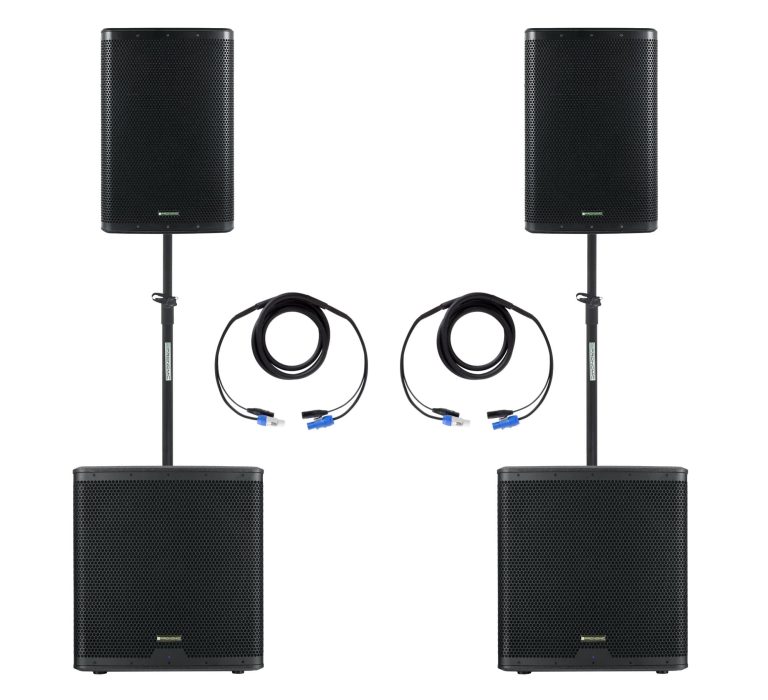 Das Live-Set von Pronomic besteht aus einem Subwoofer und 2 Hochtönern, welche auch alleine als mobile Fullrange-Lautsprecher genutzt werden können. Zusammen mit den Stativen lässt sich damit richtig einheizen.