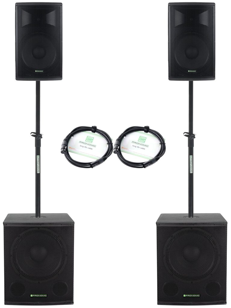 Das Live-Set von Pronomic besteht aus 2 Subwoofern und 2 Hochtönern, welche auch alleine als mobile Fullrange-Lautsprecher genutzt werden können. Zusammen mit den Distanzstangen lässt sich damit richtig einheizen.