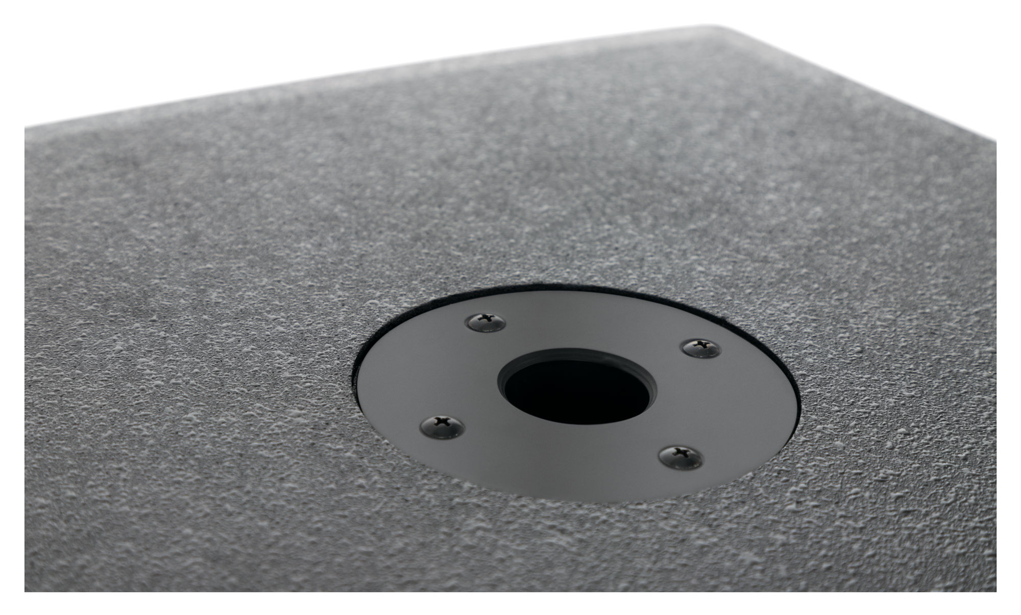 Die stabilen MDF-Platten mit 15 mm Stärke sind mit unempfindlichem Strukturlack versehen. An beiden Seiten befinden sich großzügige Griffschalen aus Metall. Natürlich ist auch der Boxenflansch für eventuelle Satelliten-Lautsprecher aus Stahl.