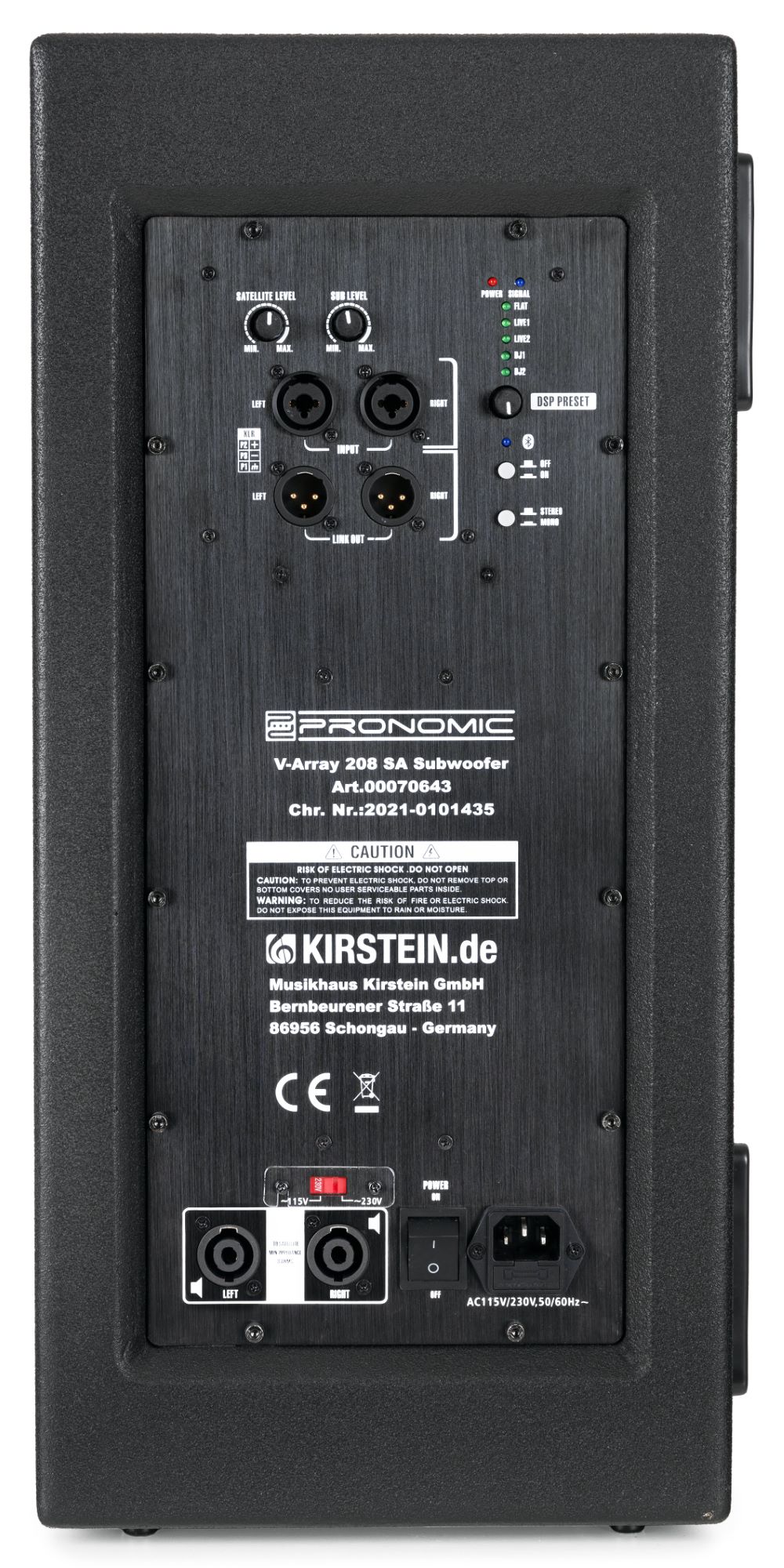 Der Subwoofer mit 15 mm-Sperrholz-Gehäuse besitzt zwei Lautsprecher mit je 8″ (20,5 cm) Durchmesser, welche von einer Class D-Endstufe angetrieben werden. Die Last-Ausgänge für die Topteile liegen im Speaker-Twist-Format vor, wobei diese wahlweise mit einem Stereo- oder einem Mono-Signal versorgt werden. Zur schnellen Anpassung an den aktuellen Einsatzzweck besitzt der Subwoofer 5 DSP-Presets und mit dem eingebauten Bluetooth®-Empfänger lässt sich die Pausenmusik sogar drahtlos abspielen.