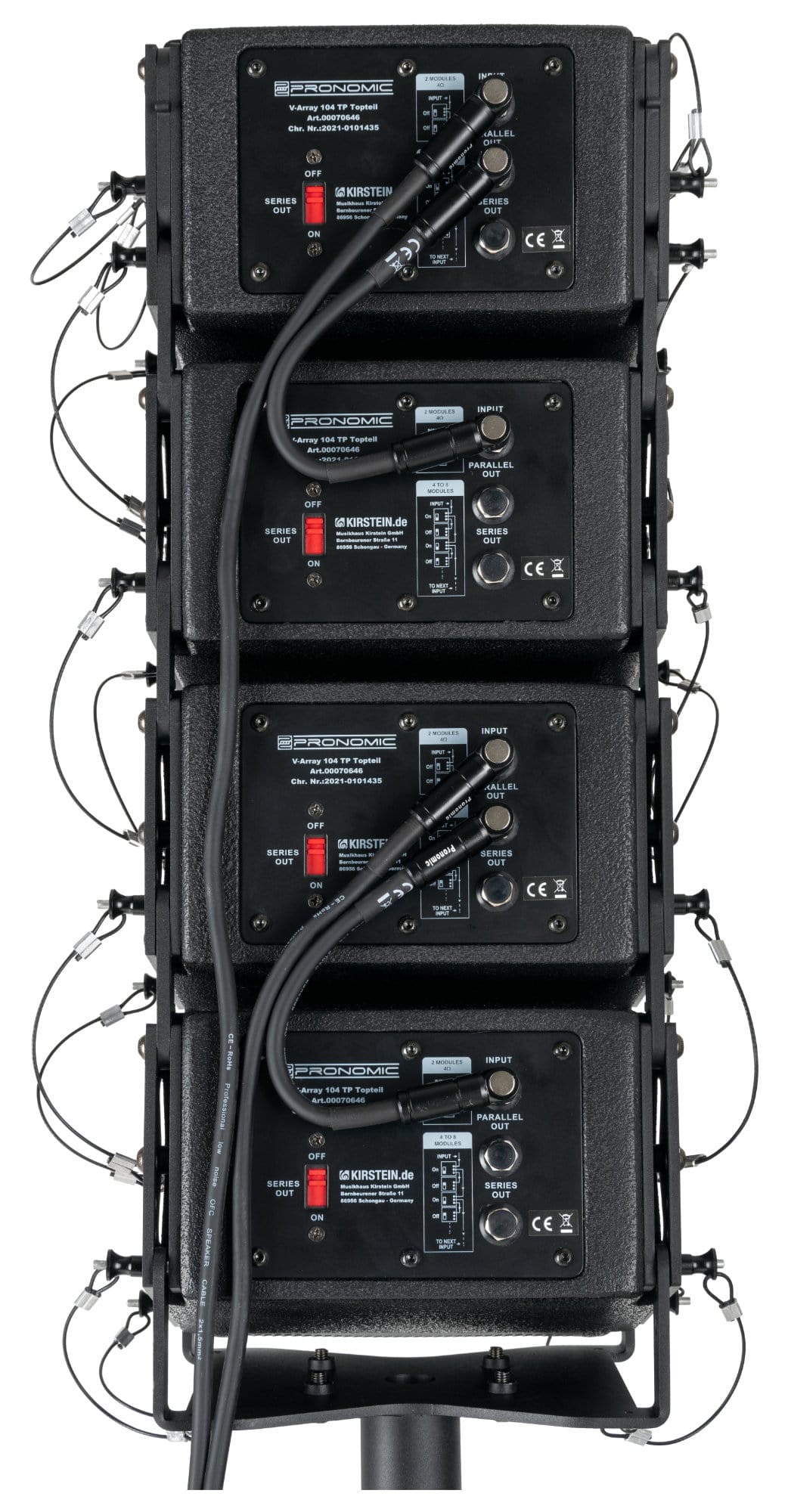 Die passiven 2-Wege-Topteile besitzen jeweils eine 4″ (10 cm) große Membran sowie einen koaxial angeordneten 1″-Hochtöner. Der besondere Clou der Pronomic V-Arrays: Alle Topteile besitzen eine Verbindungsmechanik, die es erlaubt, mehrere Elemente miteinander zu verbinden und deren Winkel (in 5°-Schritten) zueinander zu justieren. Die Topteile lassen sich sowohl parallel als auch seriell miteinander verbinden, um den insgesamt benötigten Widerstand herzustellen. Die für Deine Konfiguration passende Verkabelung ist in der Bedienungsanleitung aufgeführt.