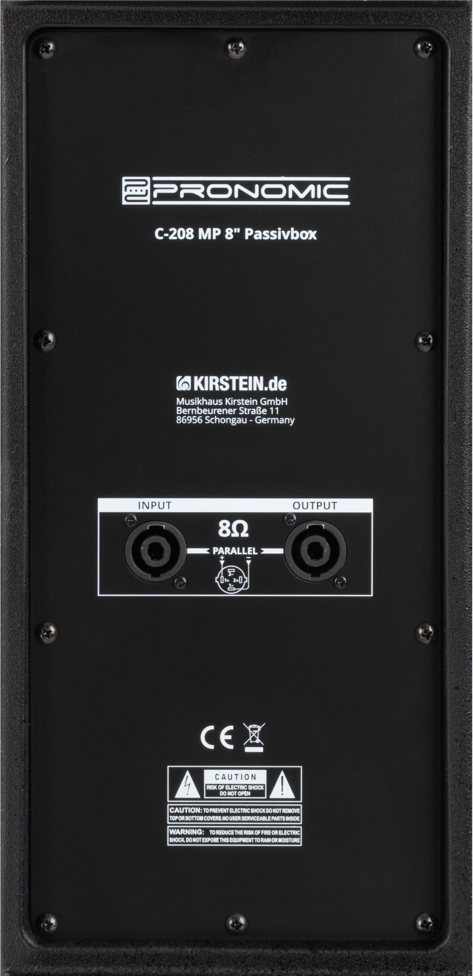 Der Lautsprecher verfügt über einen professionellen SPK-kompatiblen Eingang sowie einen parallel verdrahteten Ausgang im selben Steckerformat. Damit kann das anliegende Signal an eine weitere passive Box weitergeleitet werden.