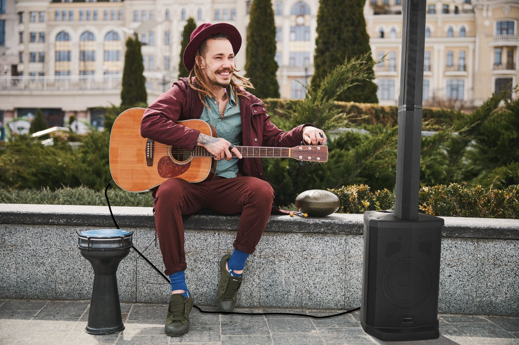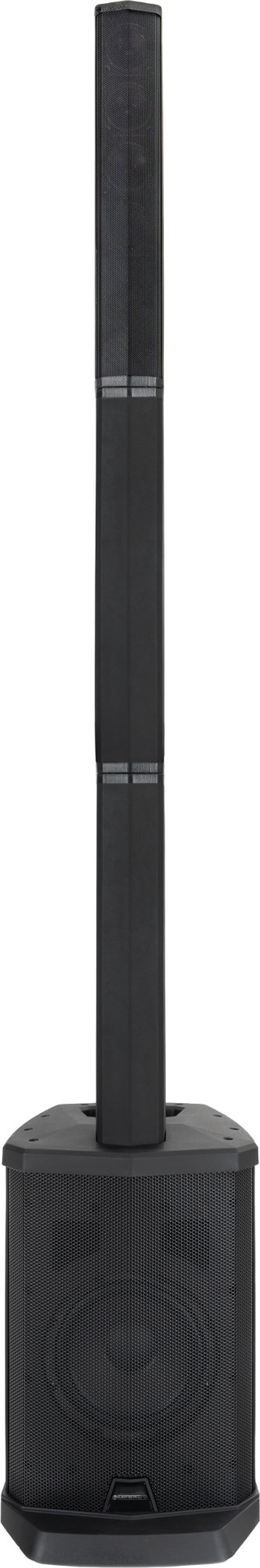 Mit einer effektiven Leistung von 100 Watt (200 Watt Peak) liefern der Subwoofer mit dem 8″-Lautsprecher und die insgesamt 4 Breitbandlautsprecher ein absolut klares und kraftvolles Sounderlebnis, wodurch sich ein kraftvoller Bass, eine hohe Sprachverständlichkeit und ein ausgewogenes Klangbild ergibt. Aufgrund des extrem breiten Abstrahlwinkels kommt auch das sich seitlich vom Lautsprecher befindende Publikum voll auf seine Kosten. Durch die vertikale Anordnung der Lautsprecher nimmt die Lautstärke mit der Entfernung deutlich geringer ab als bei herkömmlichen Anlagen, wodurch sich eine sehr homogene Schallverteilung im gesamten Raum ergibt.
