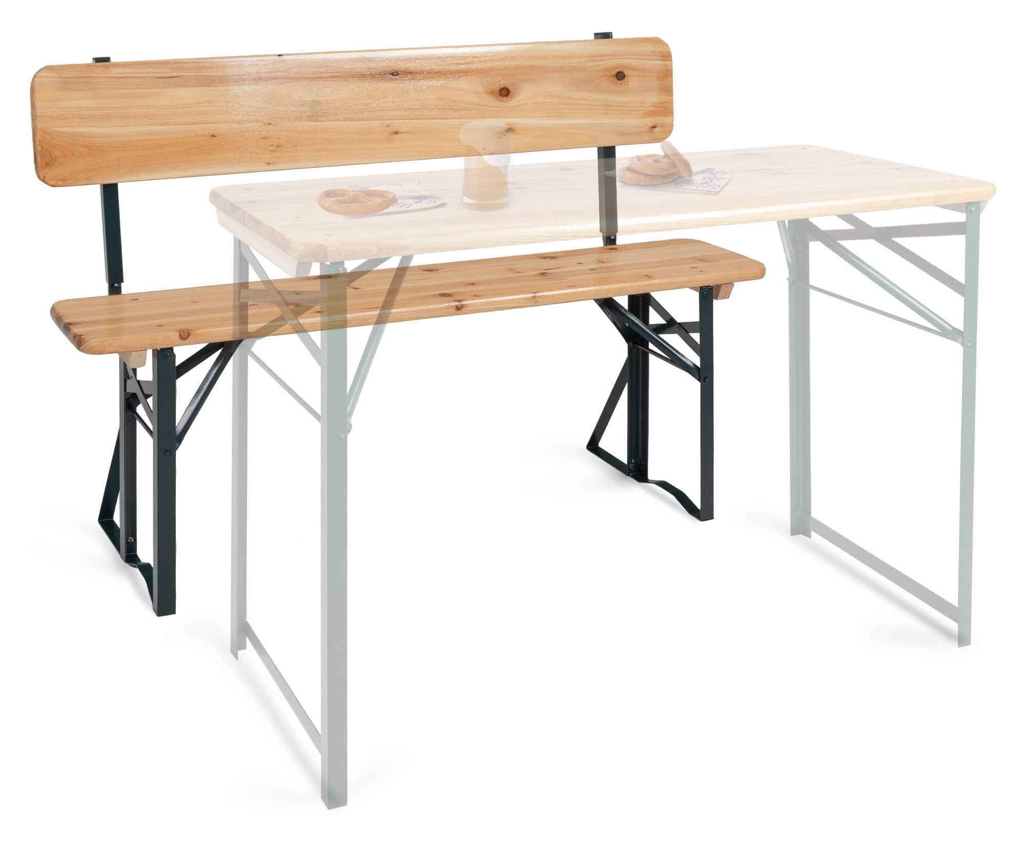 Die Version mit Rückenlehne bietet im Vergleich zum Standardmodell einen noch höheren Sitzkomfort. Zudem sind die Bänke durch den extra montierten Klappmechanismus einfach aufzubauen. Lediglich vor dem ersten Aufbau müssen noch die Rückenlehnen mit den Metallteilen verschraubt werden, was mit einem gängigen Kreuzschraubendreher schnell erledigt ist.