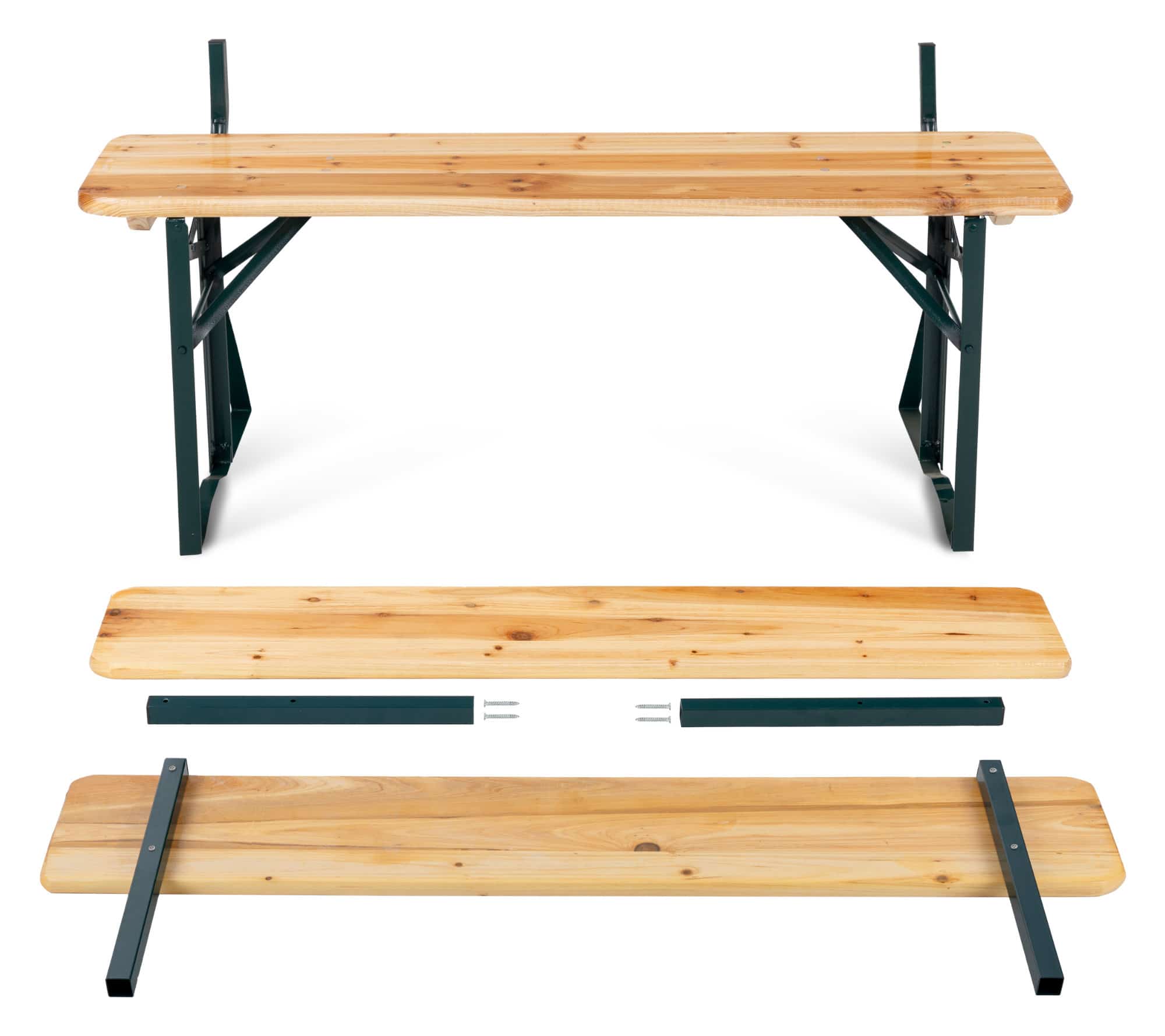 Durch Scharniere auf der Unterseite und stabile, klappbare Stahlgestelle wird der Auf- und Abbau zu einem echten Kinderspiel. Bei Nichtgebrauch oder zum Transport lässt sich die Sitzbank auch leicht und platzsparend wieder verstauen.