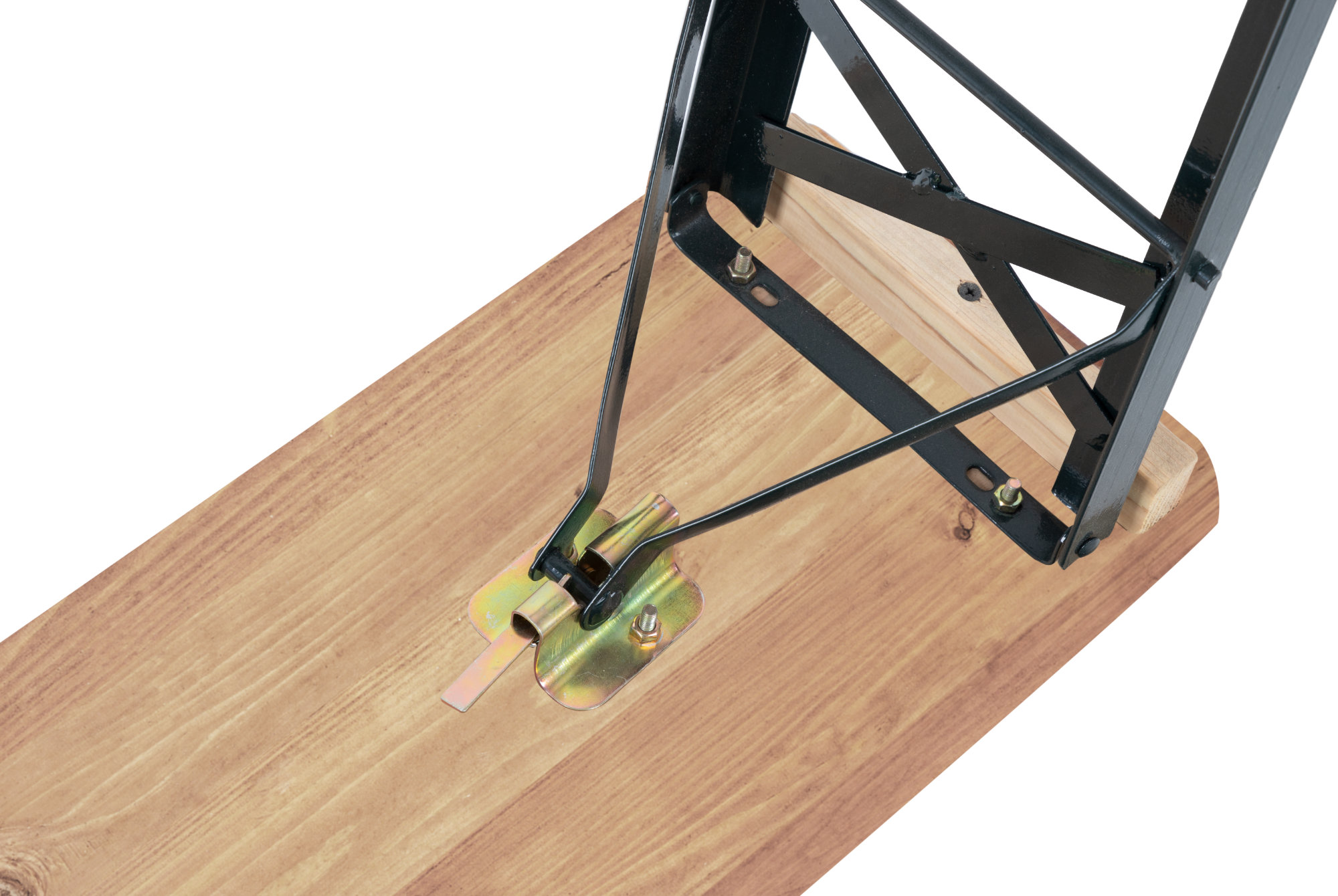 Durch Scharniere auf der Unterseite und stabile, klappbare Stahlgestelle wird der Auf- und Abbau zu einem echten Kinderspiel. Bei Nichtgebrauch oder zum Transport lässt sich die Sitzbank auch leicht und platzsparend wieder verstauen.