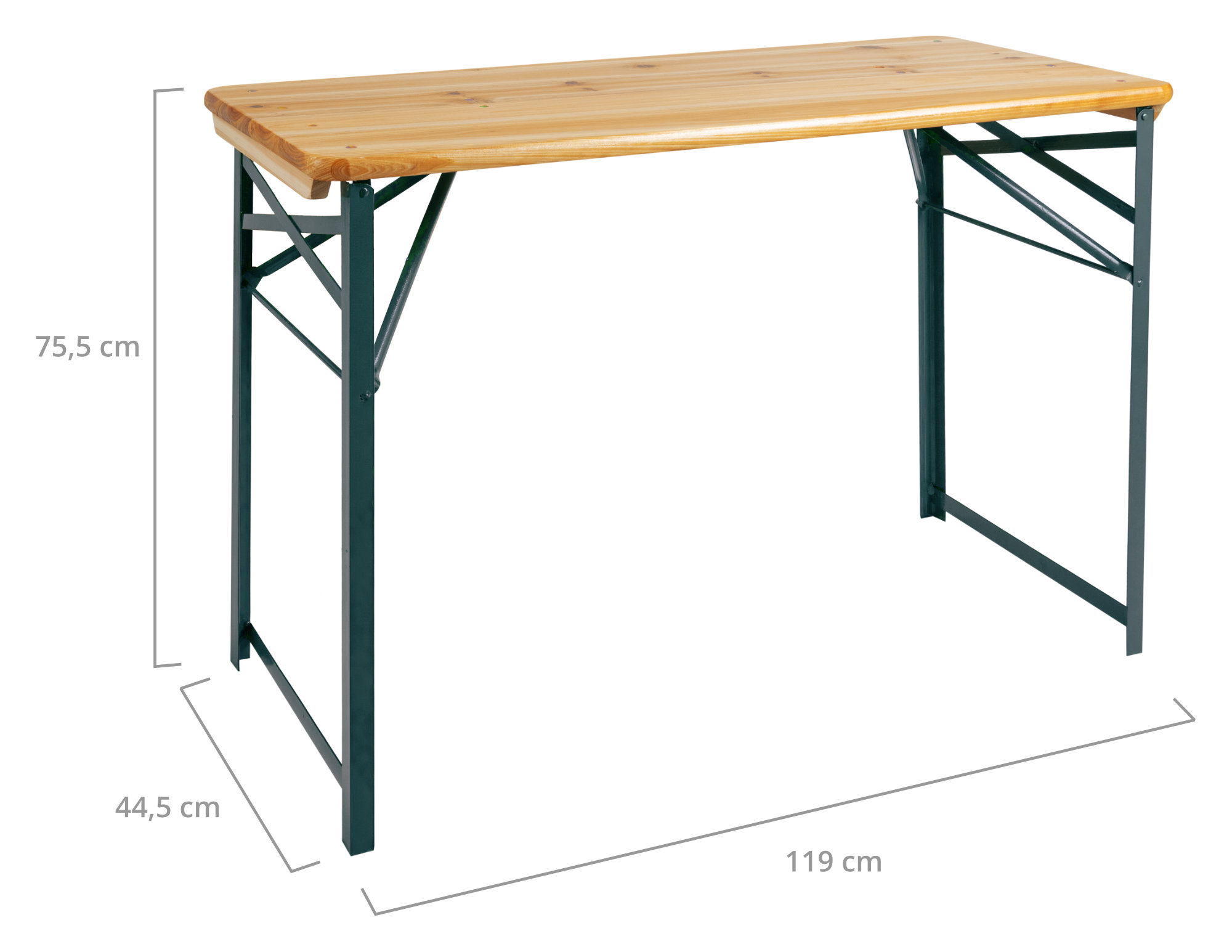Diese gegenüber einer Standard-Länge verkürzte Variante besitzt eine Länge von 119 cm. Dadurch bietet sich die Möglichkeit, auch in beengten Gartenlauben oder auf Balkonen echtes Biergarten-Flair zu erzeugen. Dabei kann der Tisch ebenso als Esstisch, als Beistelltisch für das Buffet oder als „Werkbank“ am Grill dienen. Im zusammengeklappten Zustand braucht er nur sehr wenig Platz und ist daher auch sofort zur Stelle, wenn etwas mehr Gäste als üblich erwartet werden.