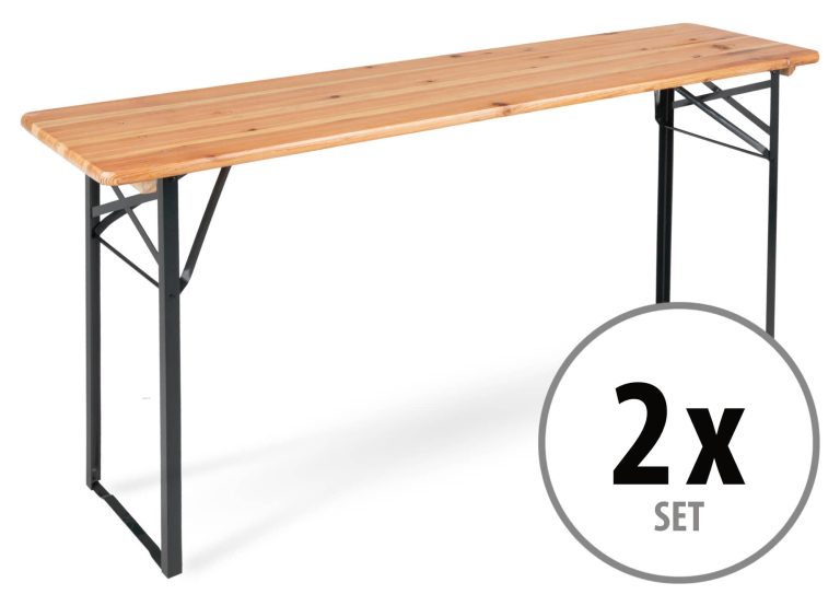 Durch Scharniere auf der Unterseite und stabile, klappbare Stahlgestelle wird der Auf- und Abbau zu einem echten Kinderspiel. Bei Nichtgebrauch oder zum Transport lässt sich der Tisch auch leicht und platzsparend wieder verstauen.