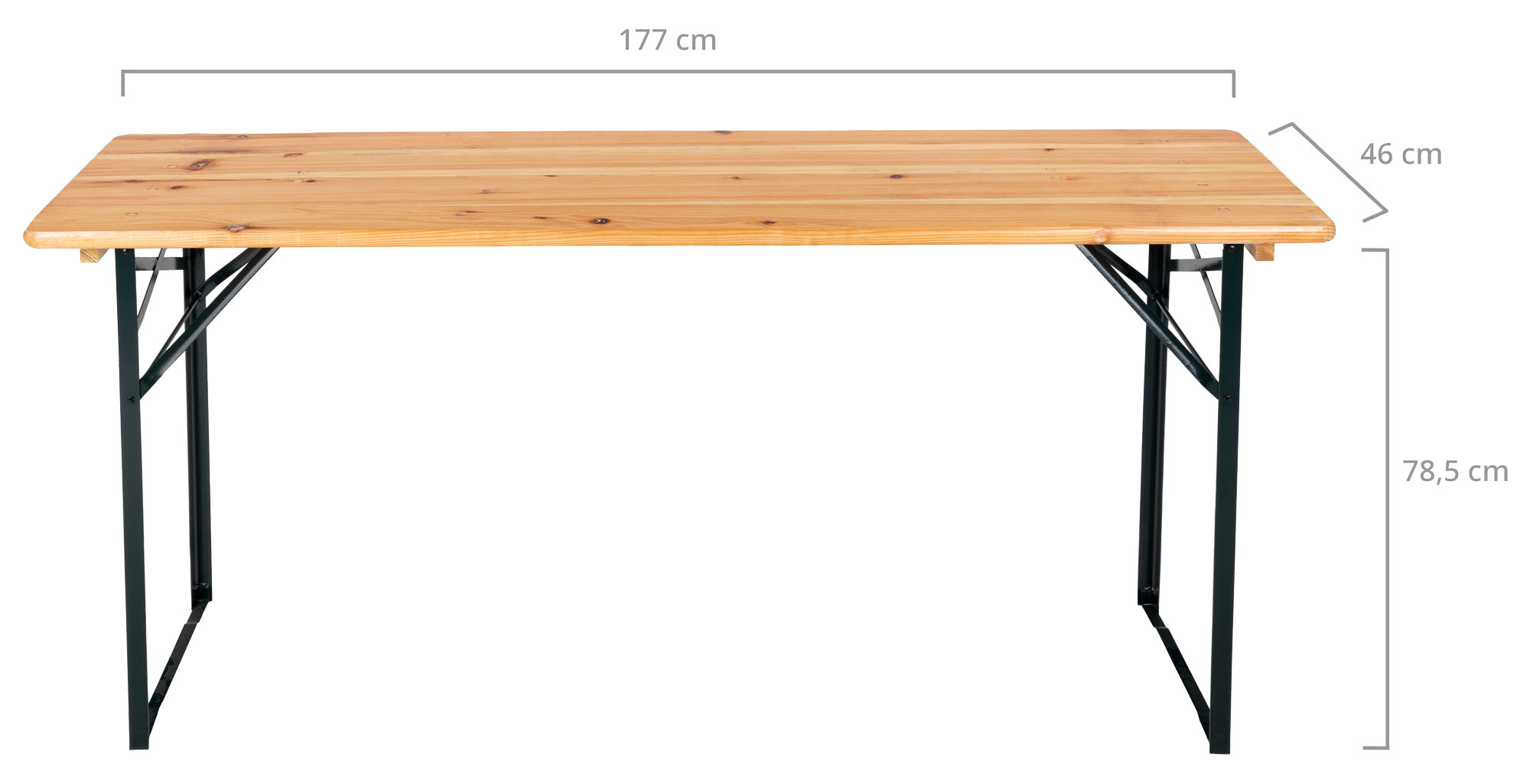 Die Hirschgarten Festzeltgarnitur hält durch ihre lackierte Oberfläche Wind und Wetter stand und kann somit auch mal auf der Terrasse bleiben, falls es einmal regnet und stürmt. Für die dauerhafte Lagerung im Freien empfiehlt sich allerdings eine Abdeckung.