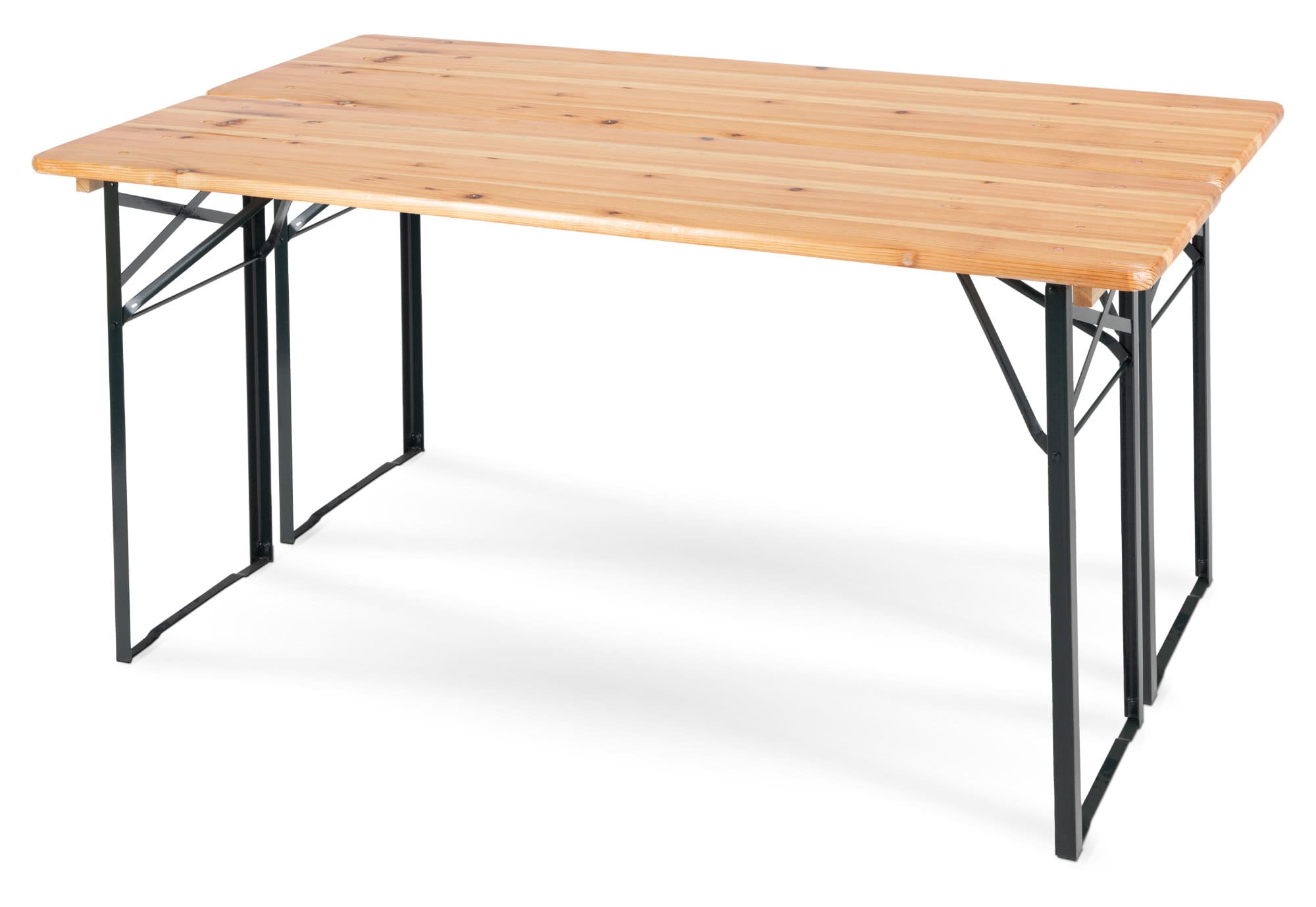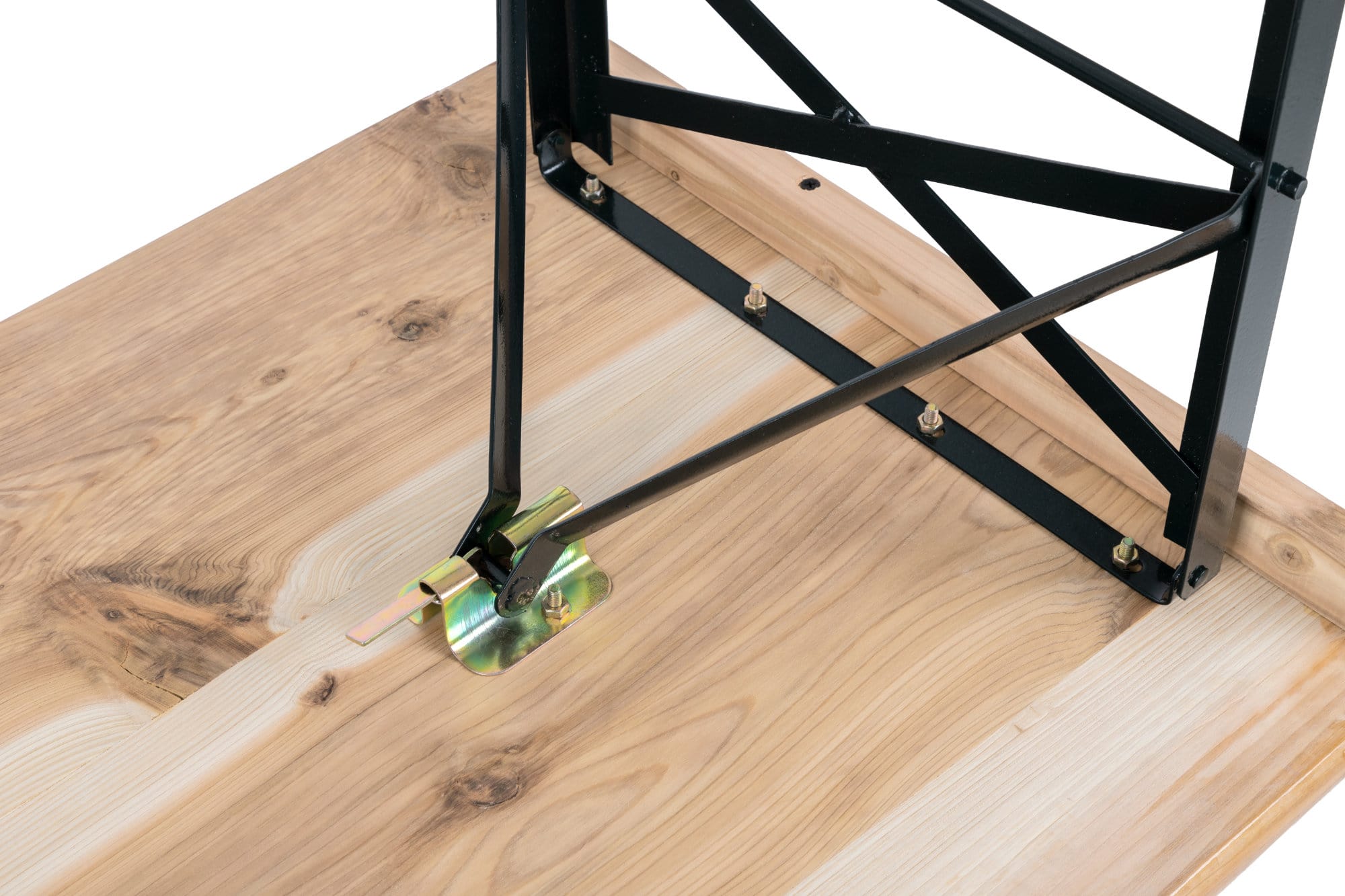 Durch Scharniere auf der Unterseite und stabile, klappbare Stahlgestelle wird der Auf- und Abbau zu einem echten Kinderspiel. Bei Nichtgebrauch oder zum Transport lässt sich der Tisch auch leicht und platzsparend wieder verstauen.