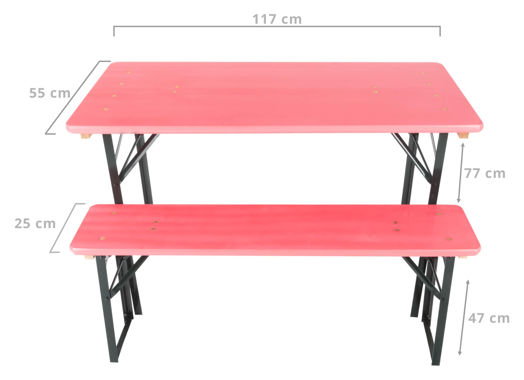 Diese gegenüber einer Standard-Bierbank verkürzte Variante besitzt eine Länge von 117 cm. Dadurch bietet sich die Möglichkeit, auch in beengten Gartenlauben oder auf Balkonen echtes Biergarten-Flair zu erzeugen. Die Maße von 117 x 25 x 47,5 cm bei den Bänken und 117 x 55 x 77 cm beim Tisch machen bequemes Sitzen auch über mehrere Stunden möglich.