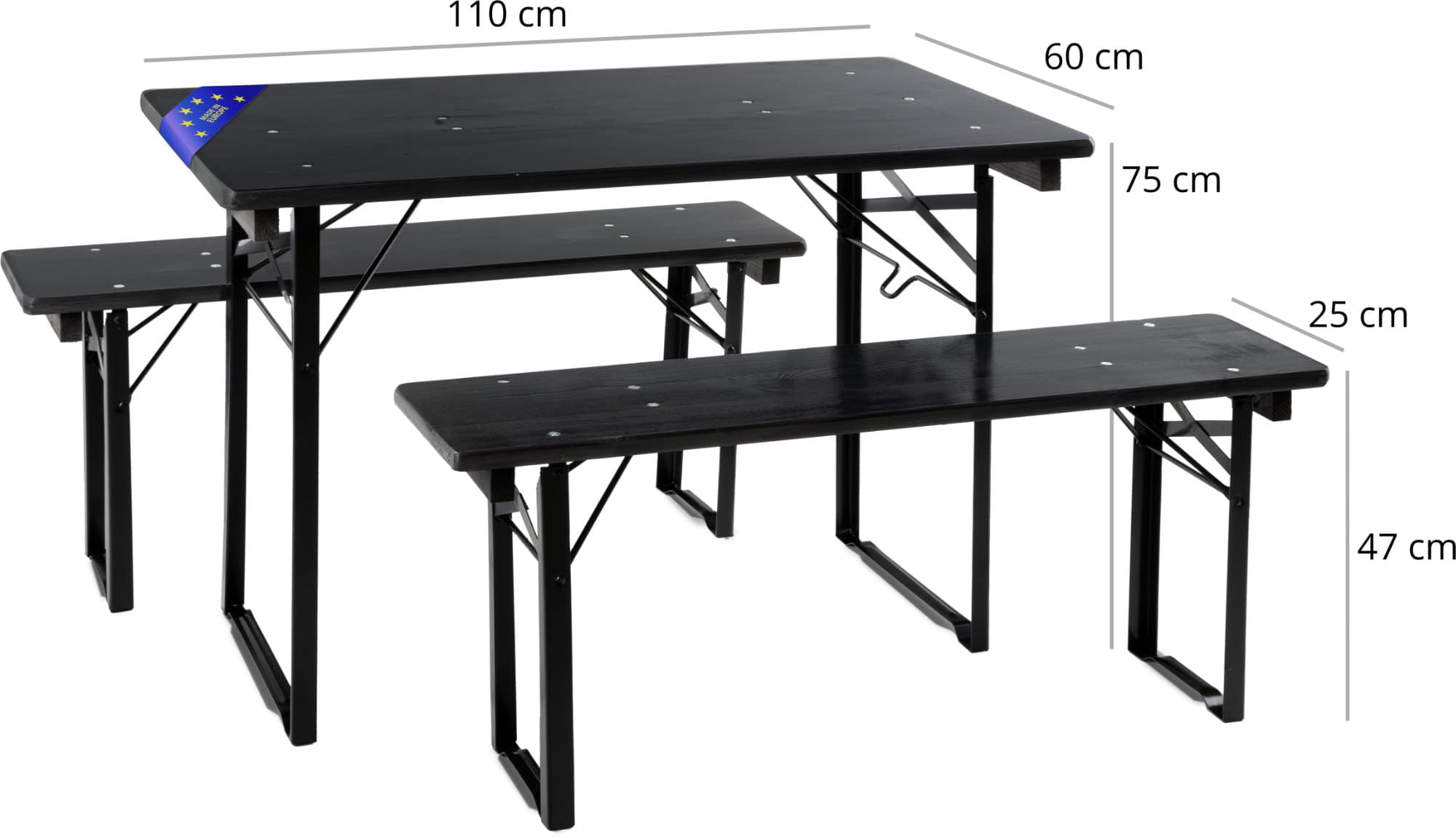 Diese gegenüber einer Standard-Bierbank verkürzte Variante besitzt eine Länge von 110 cm. Dadurch bietet sich die Möglichkeit, auch in beengten Gartenlauben oder auf Balkonen echtes Biergarten-Flair zu erzeugen. Die Maße von 110 x 25 x 47,5 cm bei den Bänken und 110 x 60 x 75 cm beim Tisch machen bequemes Sitzen auch über mehrere Stunden möglich.
