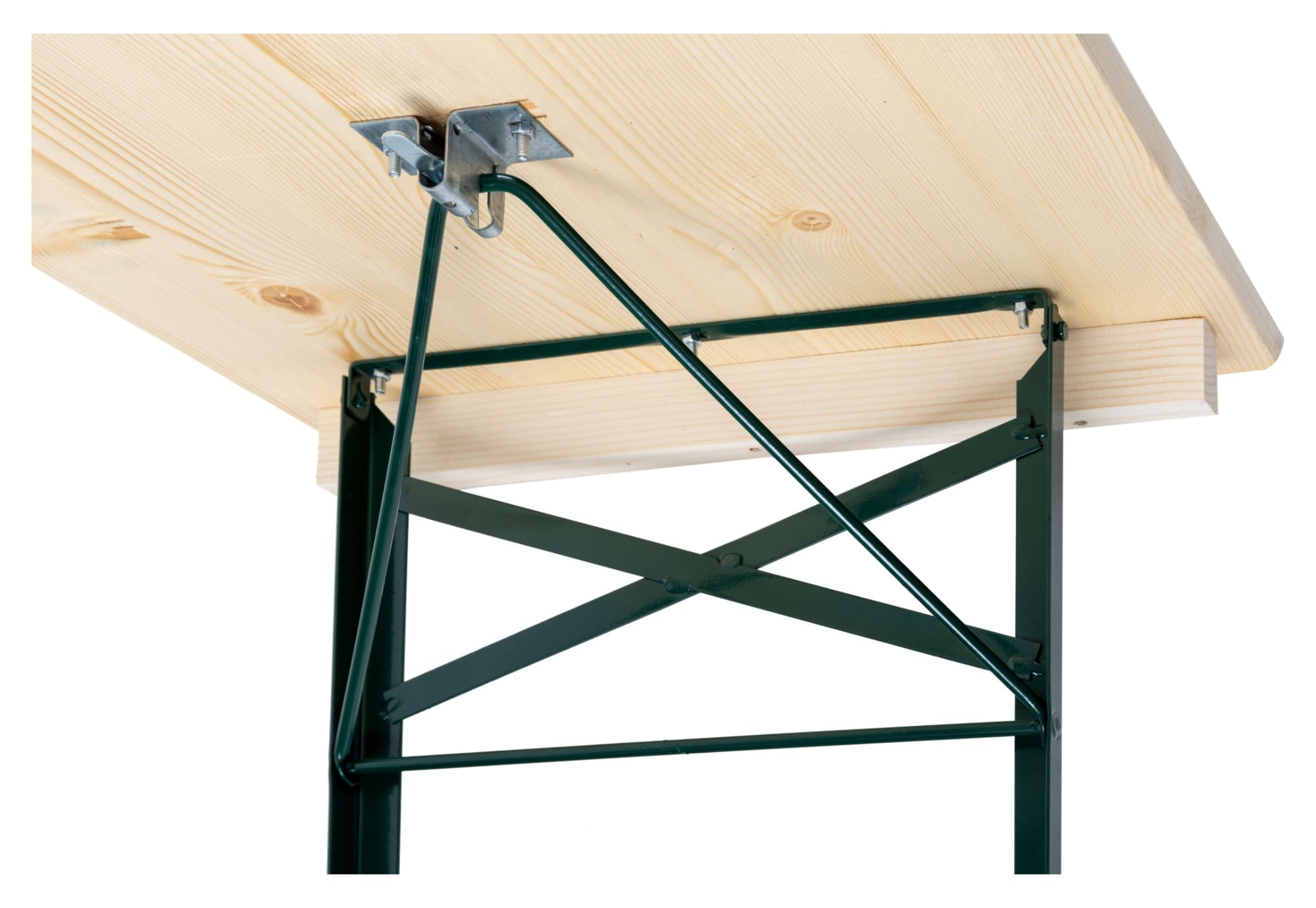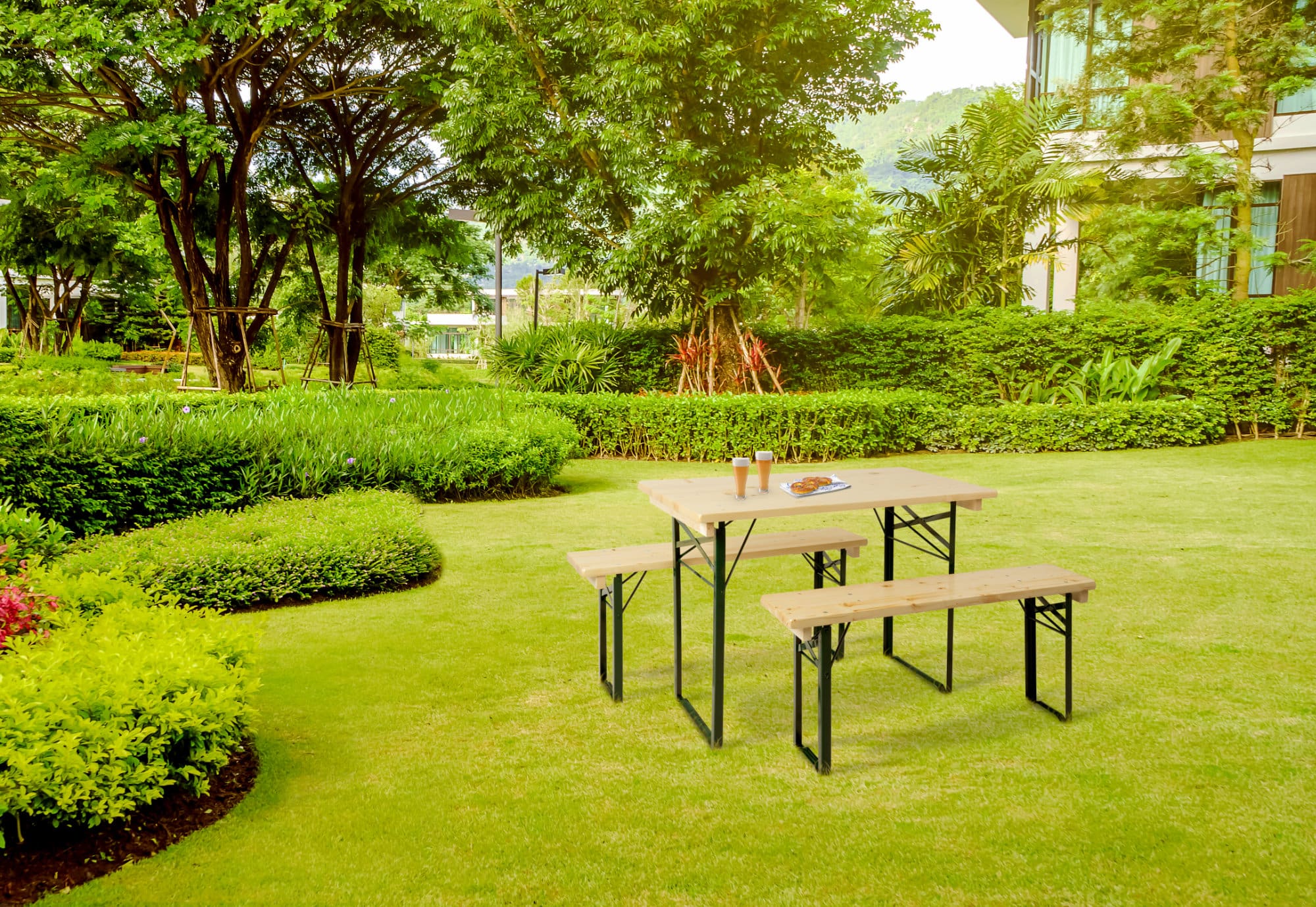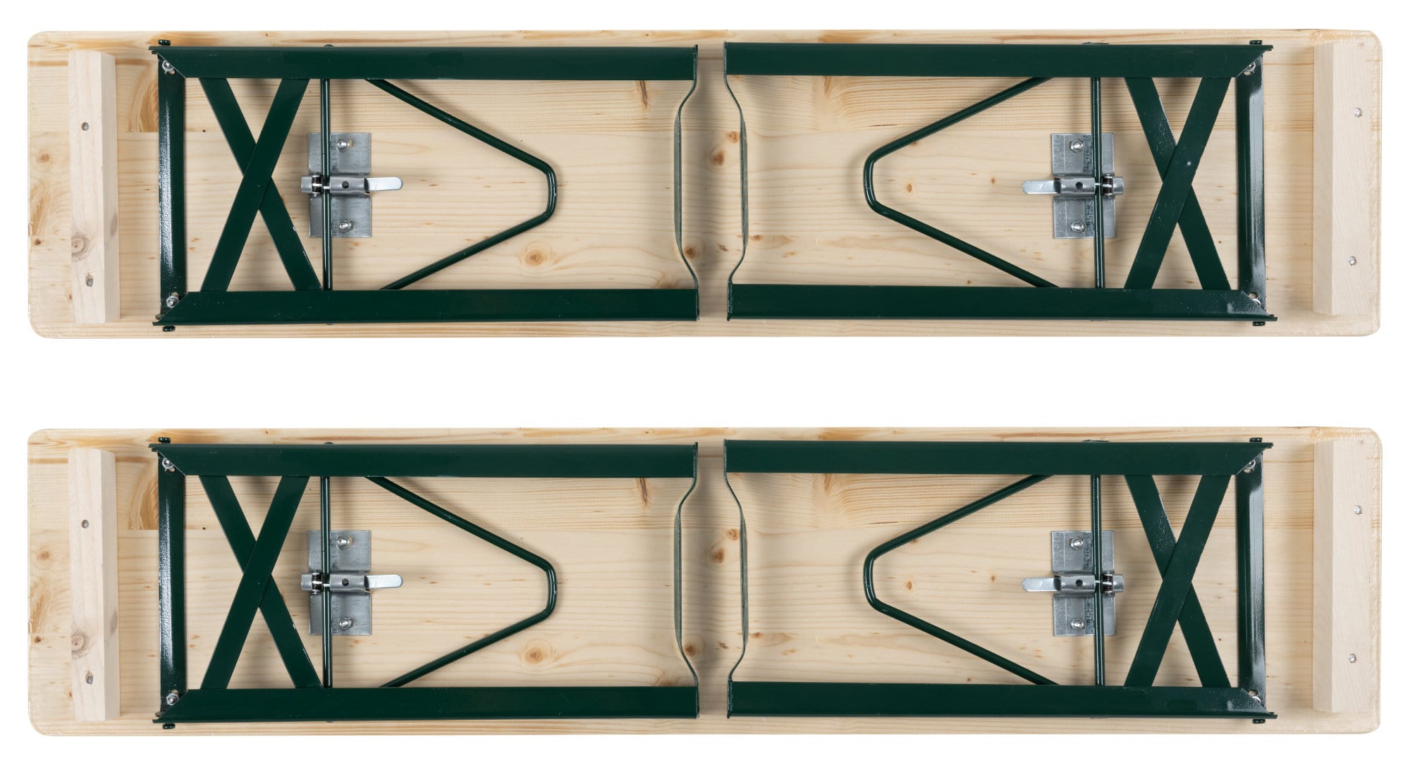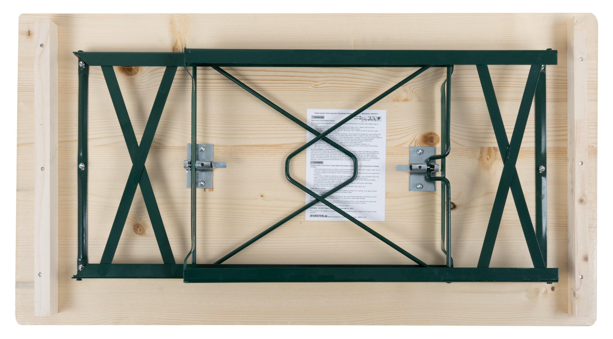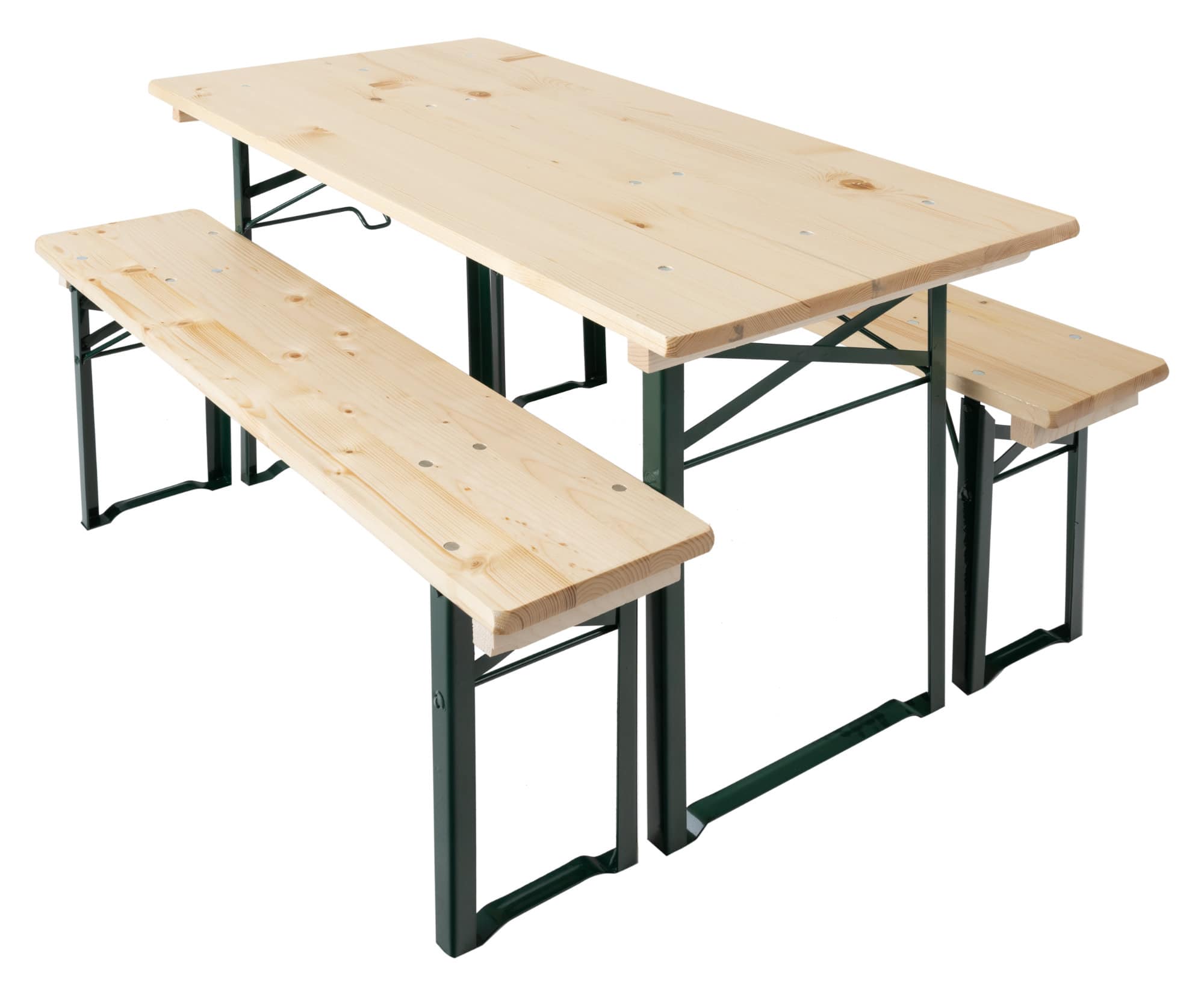 Durch Scharniere auf der Unterseite und stabile, klappbare Stahlgestelle wird der Auf- und Abbau zu einem echten Kinderspiel. Bei Nichtgebrauch oder zum Transport lassen sich die Sitzbank und der Tisch auch leicht und platzsparend wieder verstauen.