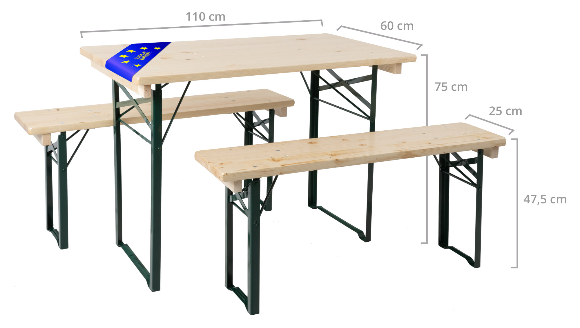 Diese gegenüber einer Standard-Bierbank verkürzte Variante besitzt eine Länge von 110 cm. Dadurch bietet sich die Möglichkeit, auch in beengten Gartenlauben oder auf Balkonen echtes Biergarten-Flair zu erzeugen. Die Maße von 110 x 25 x 47,5 cm bei den Bänken und 110 x 60 x 75 cm beim Tisch machen bequemes Sitzen auch über mehrere Stunden möglich.