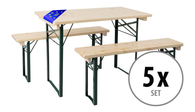 Die Hirschgarten Festzeltgarnitur hält durch ihre lackierte Oberfläche Wind und Wetter stand und kann somit auch mal auf der Terrasse bleiben, falls es einmal regnet und stürmt. Für die dauerhafte Lagerung im Freien empfiehlt sich allerdings eine Abdeckung.