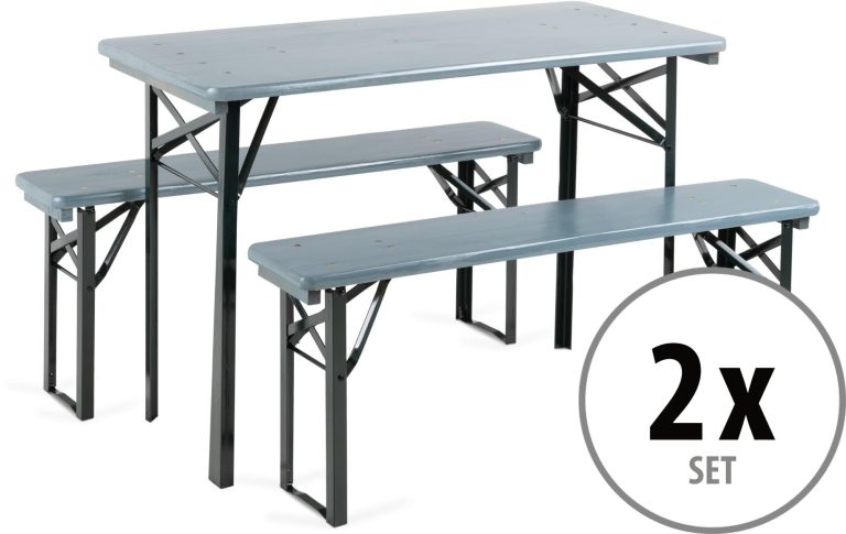Durch Scharniere auf der Unterseite und stabile, klappbare Stahlgestelle wird der Auf- und Abbau zu einem echten Kinderspiel. Bei Nichtgebrauch oder zum Transport lassen sich die Sitzbank und der Tisch auch leicht und platzsparend wieder verstauen.