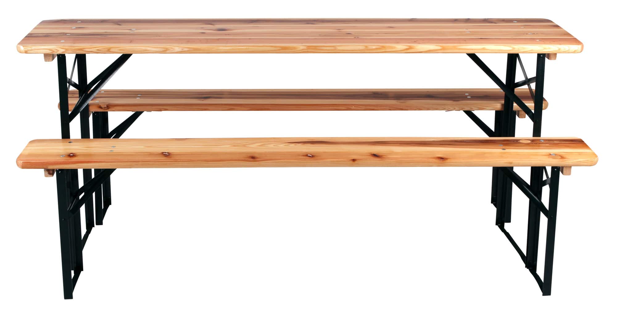 Die Hirschgarten Festzeltgarnitur hält durch ihre lackierte Oberfläche Wind und Wetter stand und kann somit auch mal auf der Terrasse bleiben, falls es einmal regnet und stürmt. Für die dauerhafte Lagerung im Freien empfiehlt sich allerdings eine Abdeckung.