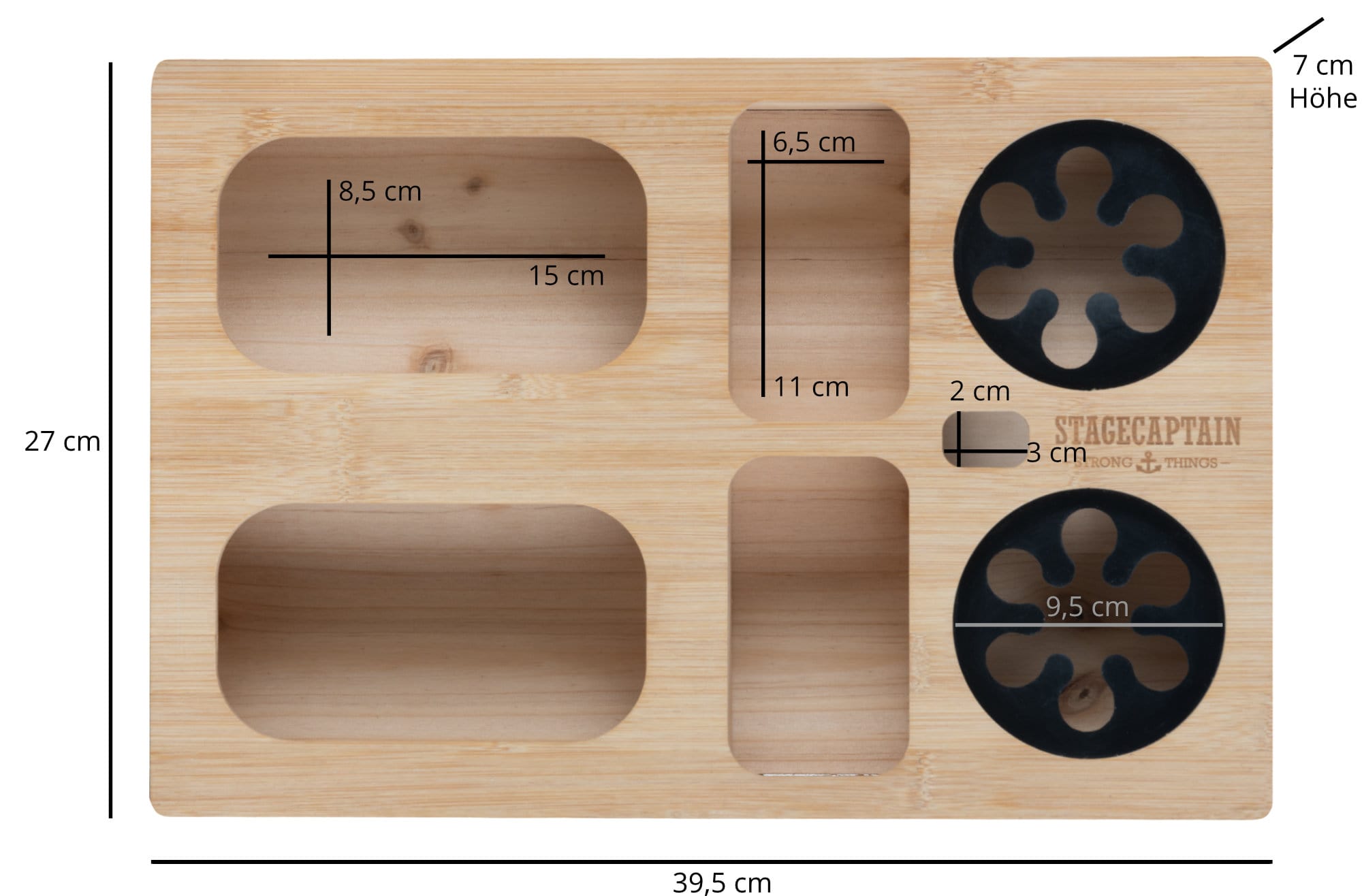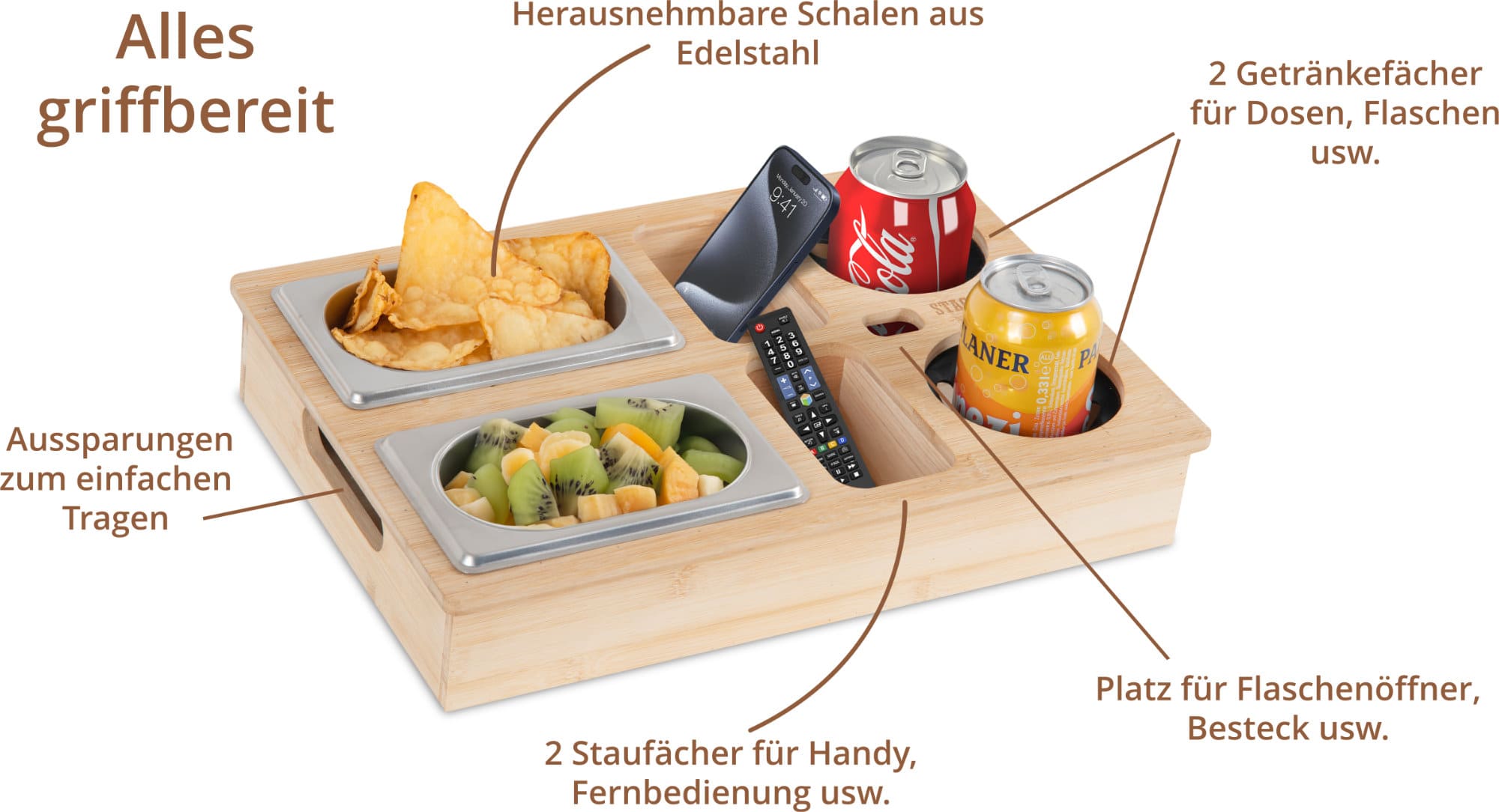 Die integrierten Getränkehalter mit Gummi-Becherfixierung sorgen dafür, dass Deine Getränke sicher und stabil stehen, während Du Dich zurücklehnst und entspannst. Zwei Edelstahlschalen bieten Platz für Knabbereien oder andere Leckereien, und das praktische Flaschenöffner- oder Besteckfach ist ein zusätzlicher Bonus für Deine Bequemlichkeit. Nie wieder mühsames Aufstehen: Alles, was Du brauchst, ist in Reichweite. Mache Dich bereit für entspannte Abende auf dem Sofa mit der Stagecaptain CBW-45 NT Couchbar!