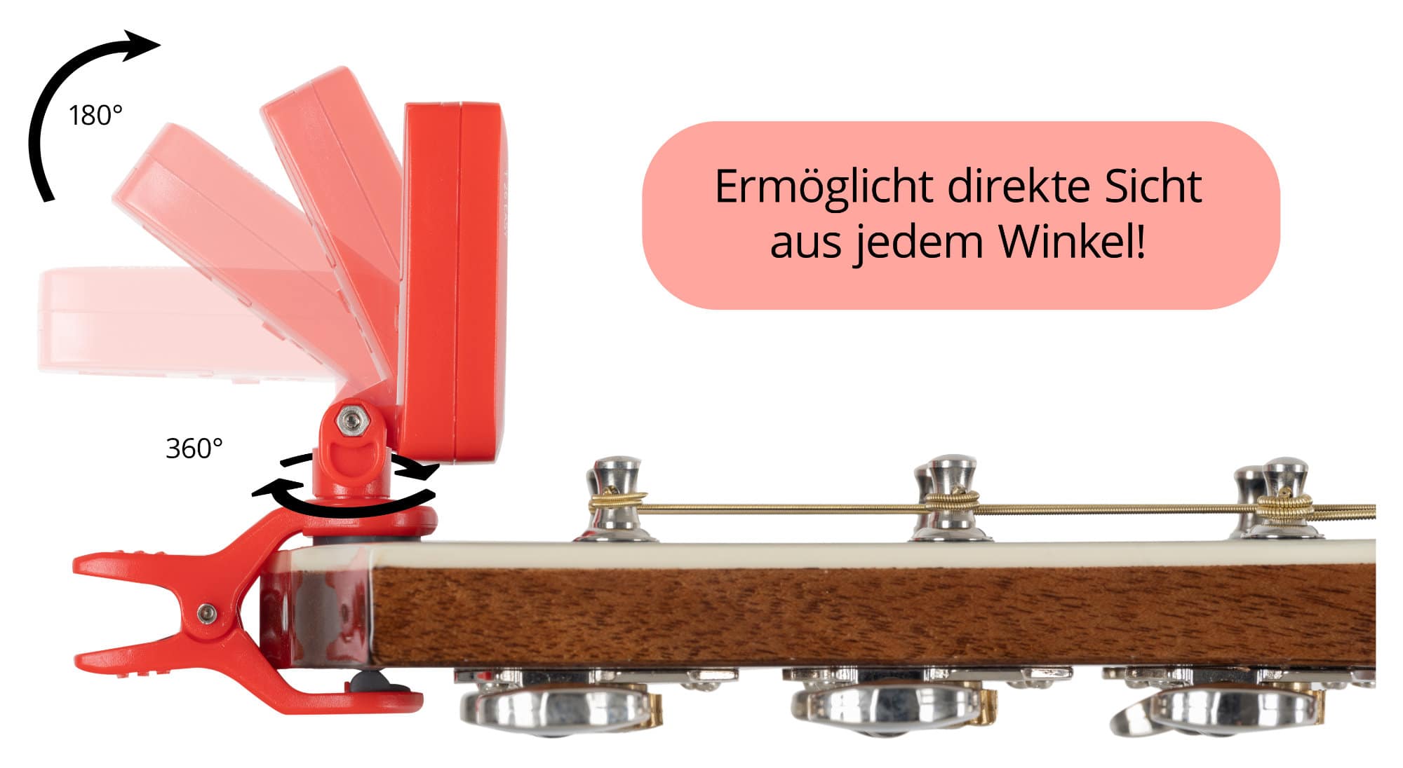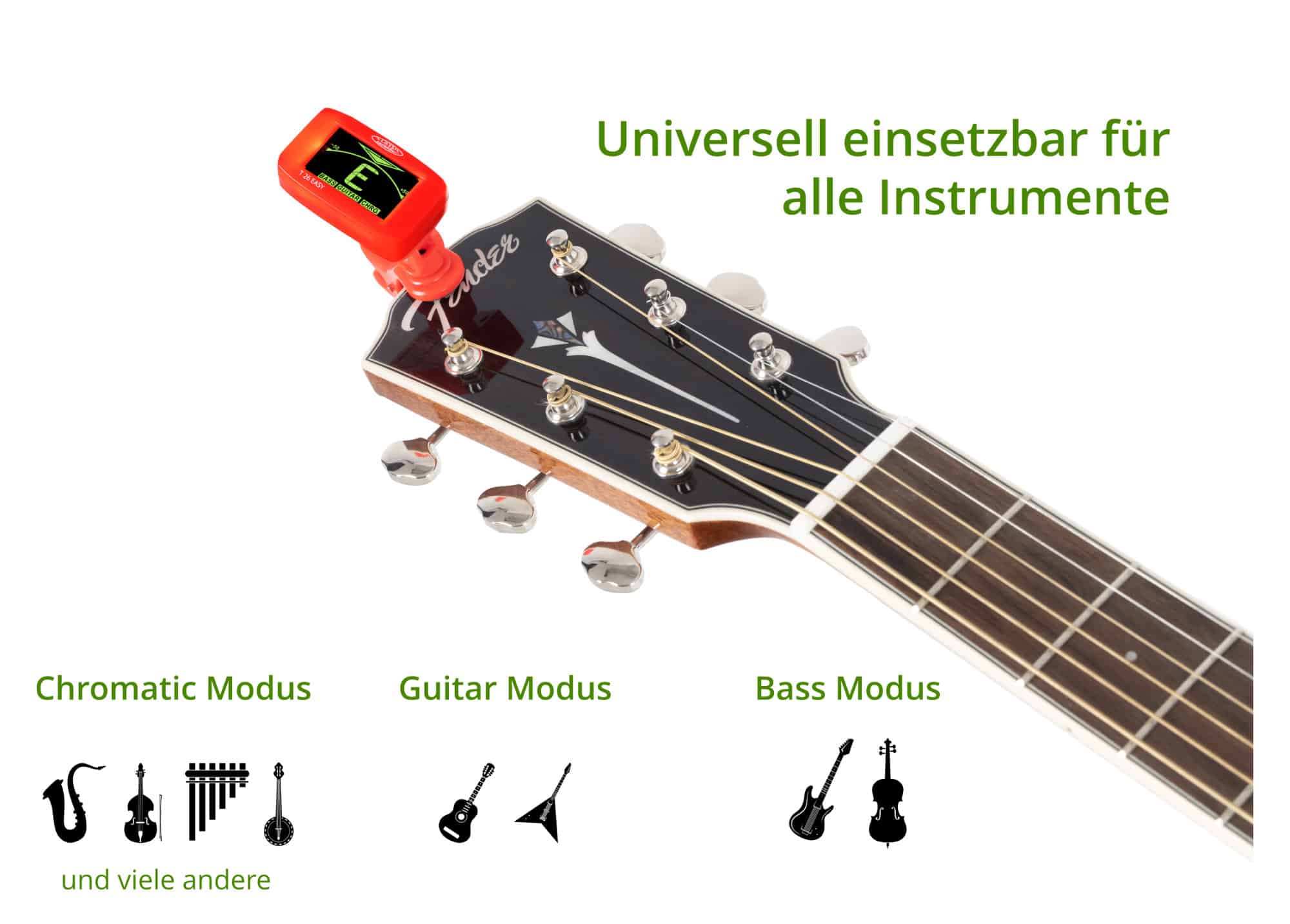 Als Standard verwendet der Cliptuner die Einstellung „Chromatic“, bei welcher der gespielte Ton und die genaue Stimmung angezeigt werden. Eine Grafik mit 12 Segmenten zeigt das akkurate Tuning auf das Cent genau an. Als zusätzliche optische Unterstützung leuchten 2 LEDs im Gehäuse in signalroter Farbe, solange die Stimmung noch nicht perfekt ist. Bei korrekter Stimmung schaltet das Display von der Farbe rot auf grün – so ist auch ein korrektes Stimmen „aus dem Augenwinkel“ möglich.