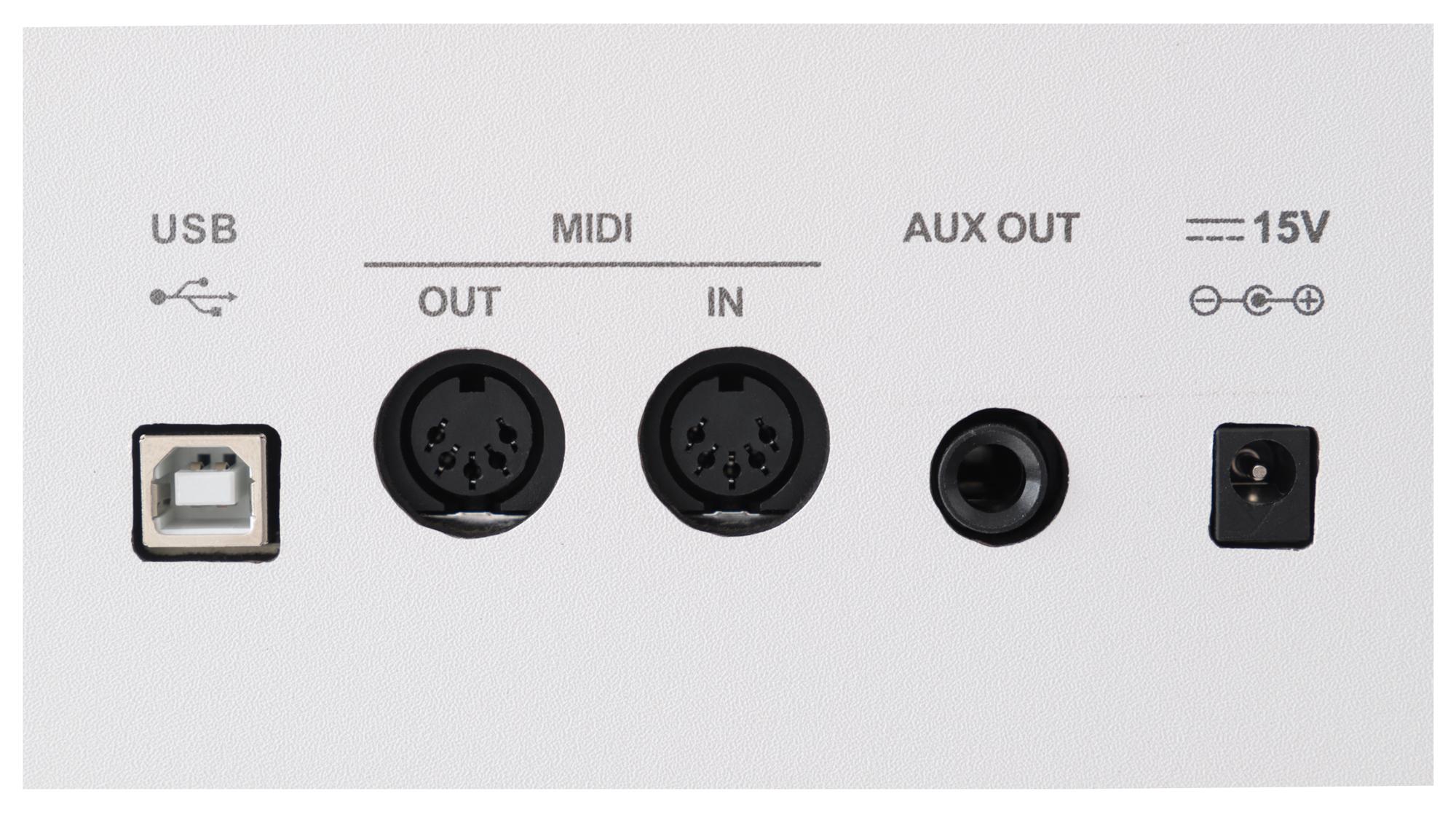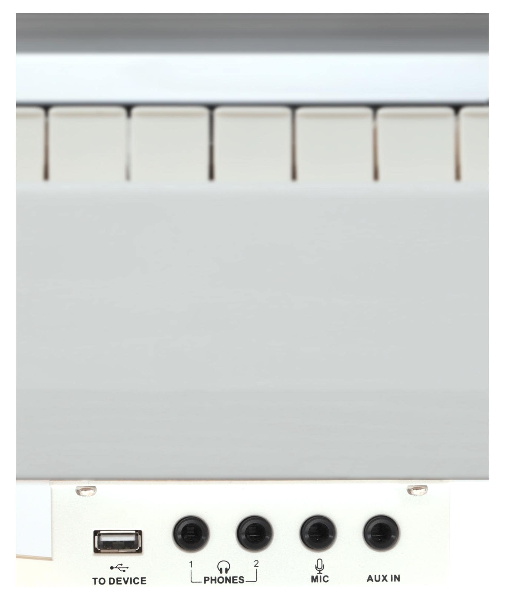 Die beiden 6,3 mm Klinken-Kopfhörerausgänge bieten die Möglichkeit, ungestört üben zu können. Sollten die Kopfhörer oder die integrierten Hi-Fi-Lautsprecher den eigenen Ansprüchen nicht genügen, besteht durch den Stereo AUX-Ausgang die Möglichkeit zum Anschluss an eine PA-Anlage oder Aktivlautsprecher. Um zu Playalongs oder Songs von CD oder Smartphone spielen zu können, wird einfach der AUX In-Anschluss genutzt.