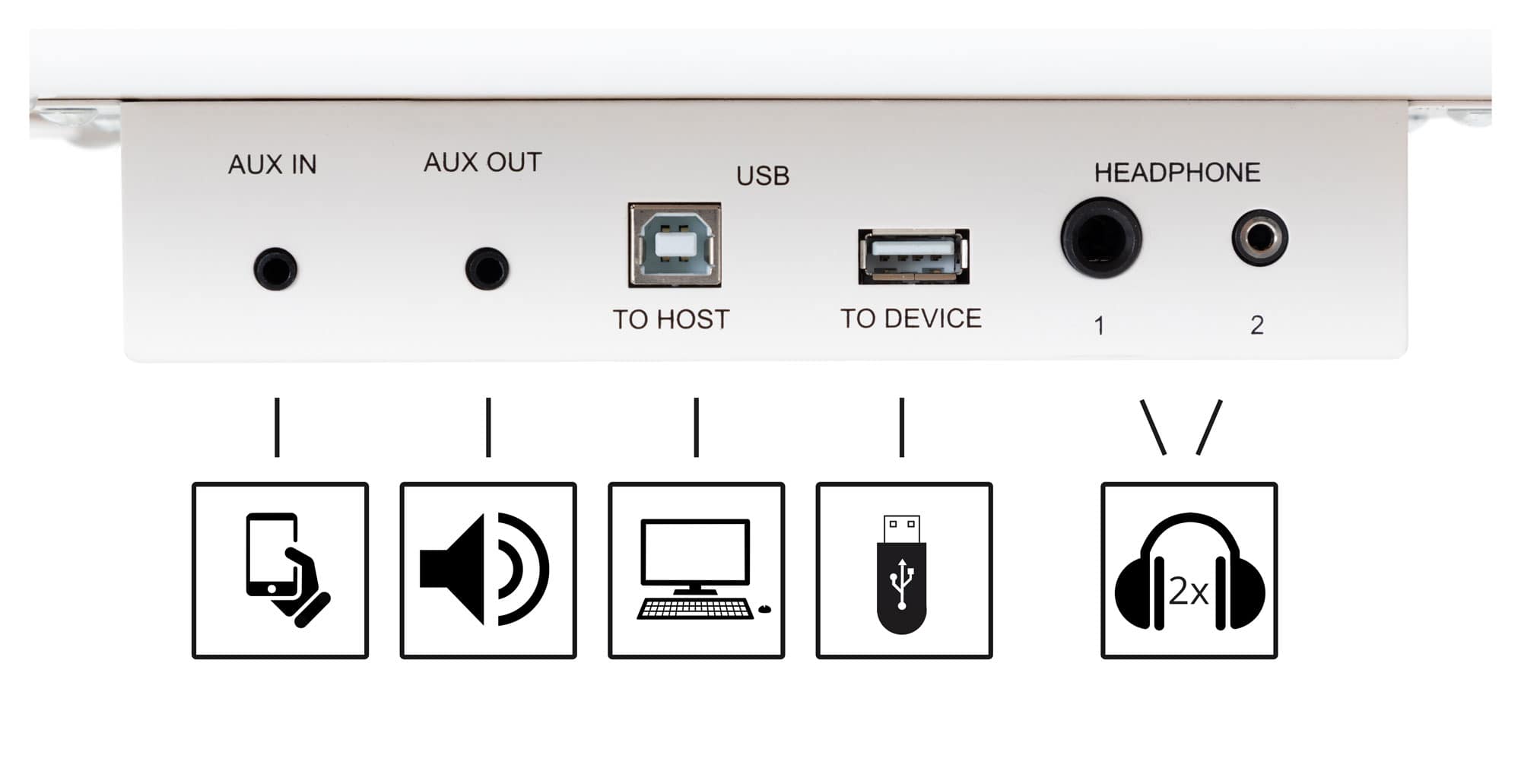 Die Anordnung der 4 Lautsprecher ermöglicht einen exzellenten Klang: Die beiden Bass-Lautsprecher sind an der Unterseite des Spieltisches montiert. Von hier aus strahlen sie den Schall nach unten ab, wobei der vom Boden reflektierte Schall einen sehr natürlichen Raumklang erzeugt. Als wirkliche Besonderheit in dieser Preisklasse strahlen die beiden Lautsprecher für die hohen Töne direkt Richtung Pianist. Durch diese besondere Anordnung ergibt sich ein überaus nuanciertes Klangbild mit vollem Charakter.