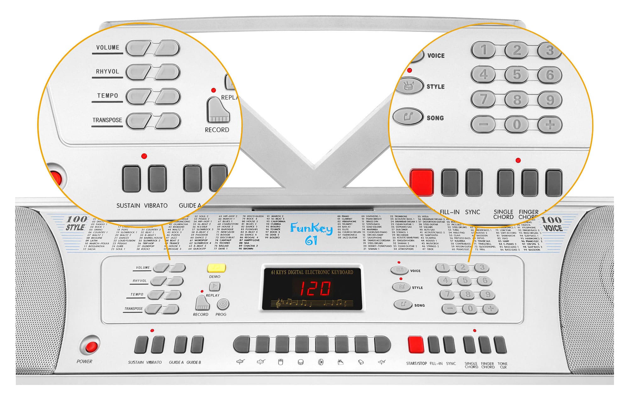 Mit 100 verschiedenen Sounds, 100 Rhythmen und einer Begleitfunktion sind schnelle Lernerfolge garantiert. Mit der Intelligent Guide Funktion können die 8 integrierten Demosongs Note für Note erlernt werden. Das FunKey 61 verfügt außerdem über eine Record-Funktion, mit der Dein Kind ganze Stücke mit Begleitung aufnehmen und wieder abspielen kann und mit der Transponier-Taste sind auch Stücke in schwierigen Tonarten ganz einfach zu spielen. Weiterhin hast Du die Möglichkeit, Deine eigenen Rhythmen zu programmieren und so Deiner Kreativität freien Lauf zu lassen.