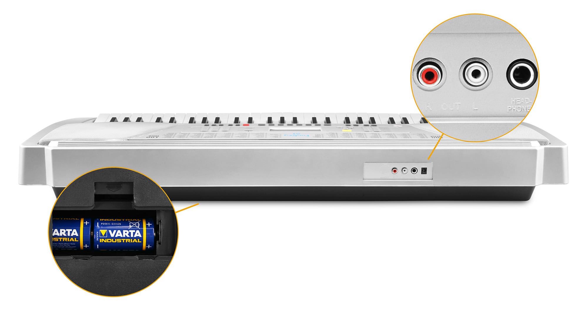 Mit dem praktischen Cinch-Ausgang an der Rückseite kann das FunKey 61 an jede Stereoanlage angeschlossen werden und sollte es doch einmal zu laut werden, steht außerdem noch ein Kopfhörerausgang zur Verfügung. Anders als Keyboards in dieser Preisklasse sind alle Sounds Stereo und im Lieferumfang befinden sich bereits ein Netzteil, ein Notenständer und eine deutsche Bedienungsanleitung!