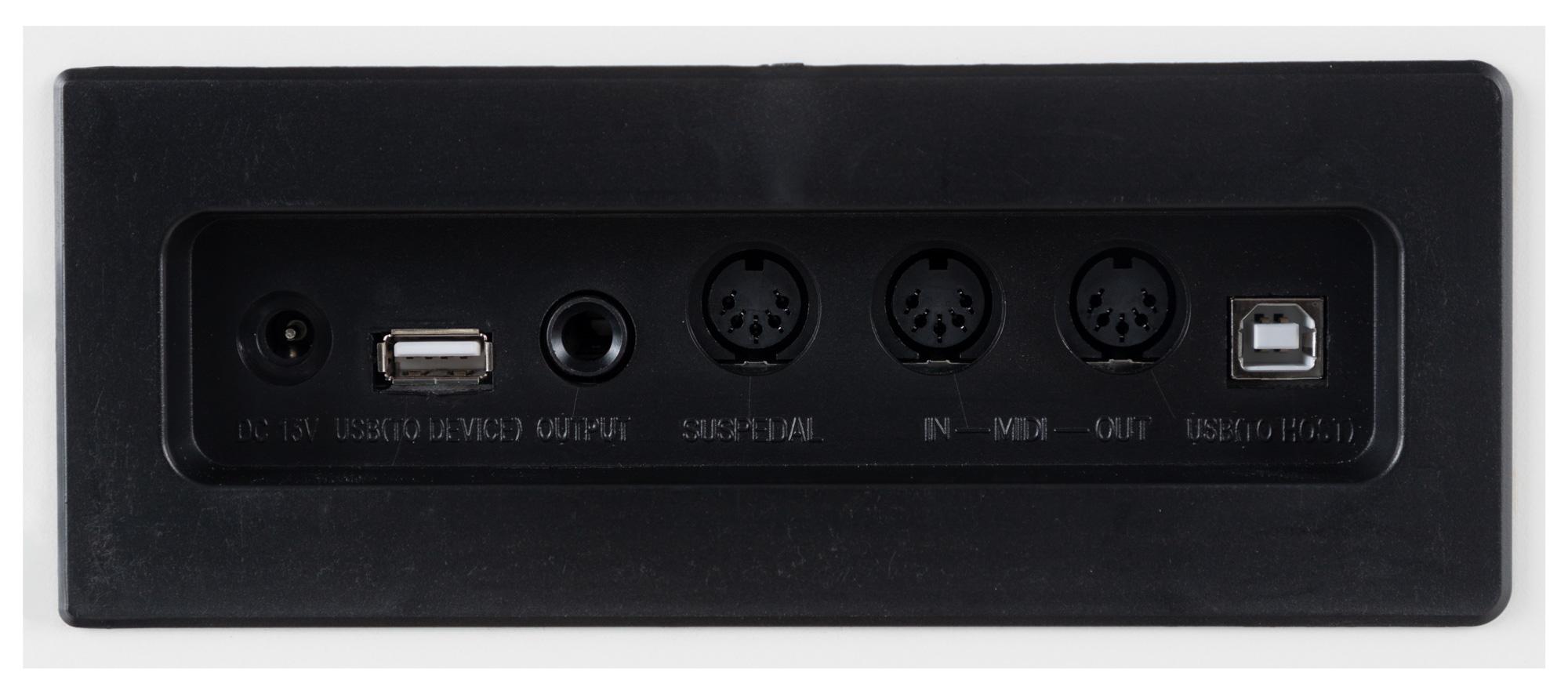 Auf der Unterseite verbaute Stereo-Lautsprecher mit je 15 W sorgen für durchsetzungsfähigen Sound. Der auf der Vorderseite angebrachte Kopfhörerausgang bietet die Möglichkeit, lautlos zu üben. Für das Spielen vor größerem Publikum ist ein 6,3 mm Klinkenausgang vorhanden, mit dem das Piano an Stereo- oder PA-Anlagen angeschlossen werden kann.