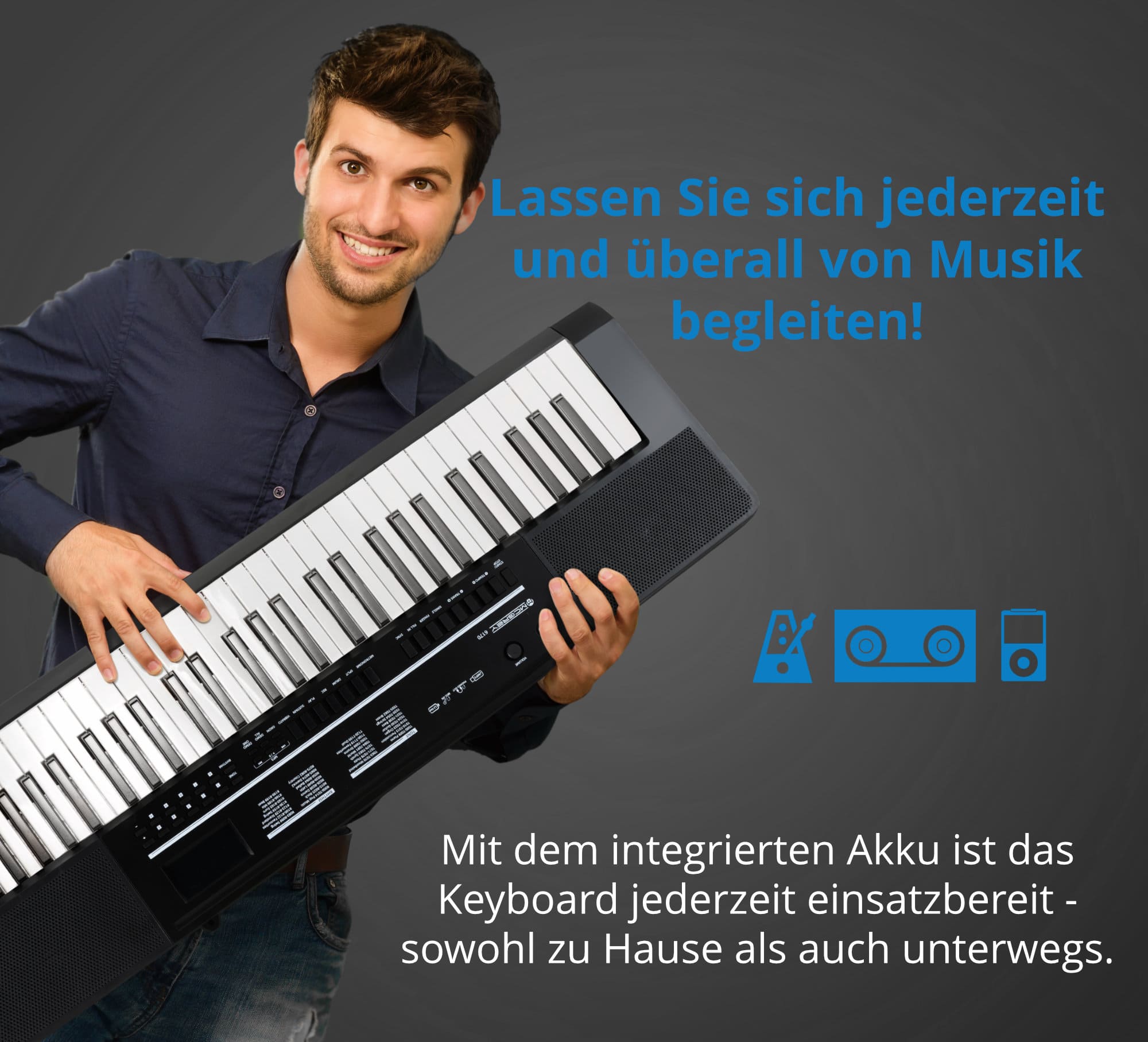 Der besondere Clou an diesem Keyboard: Die Stromversorgung (und somit auch das Aufladen des Akkus) erfolgt über ein USB-Netzteil. Ist der Akku einmal aufgeladen, ist das Keyboard mit einem Tastendruck einsatzbereit, ohne dass man lange nach einer Steckdose suchen muss. Und selbst dann reicht sogar eine (USB-)Lademöglichkeit im Fahrzeug.
