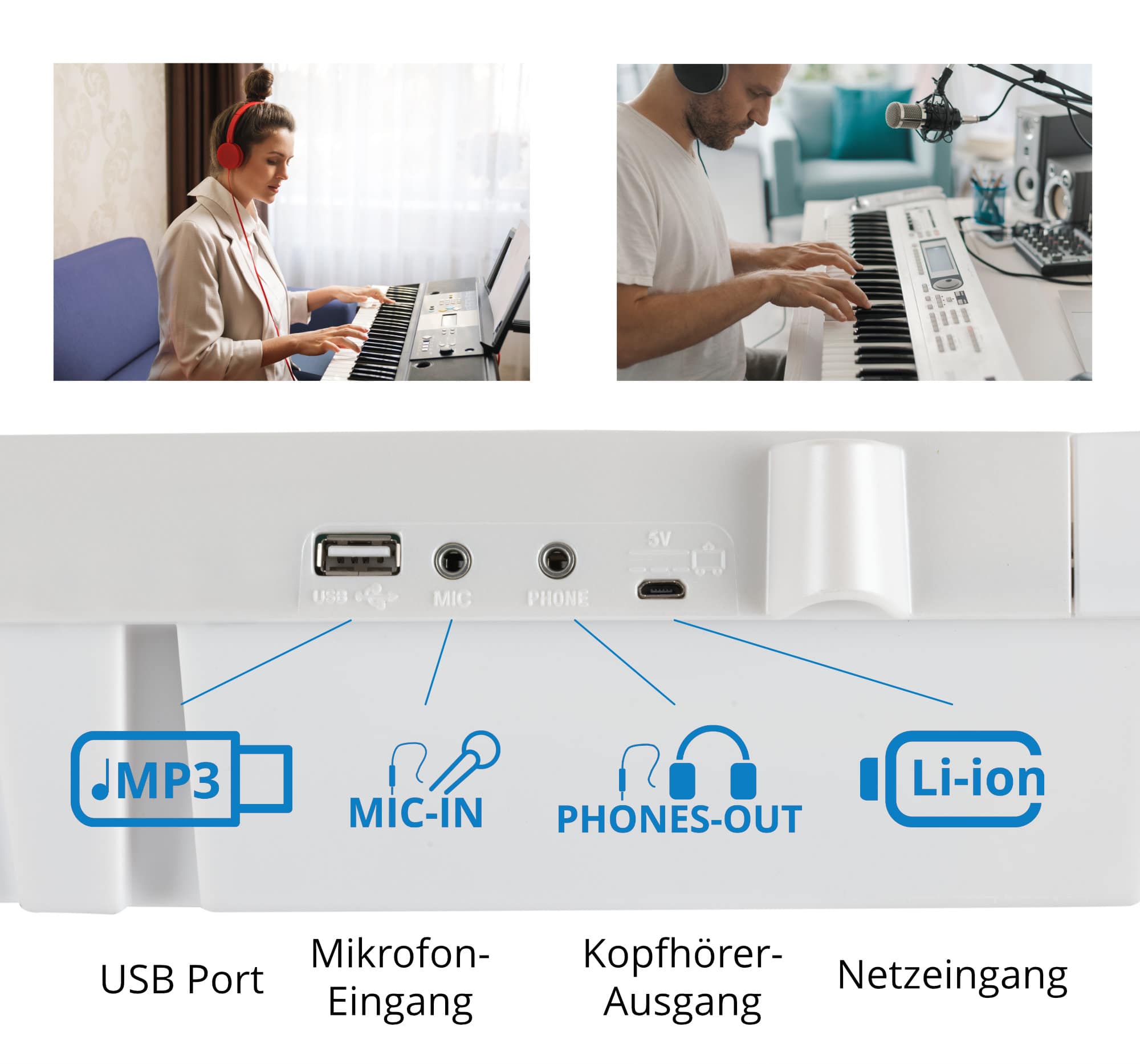 Du willst zu Deinen Lieblings-Hits spielen? Der integrierte Medienplayer macht’s möglich! Einfach einen USB-Stick mit den gewünschten Dateien im MP3-Format einstecken und los geht’s! Die Steuerung des Players geschieht direkt am Keyboard.