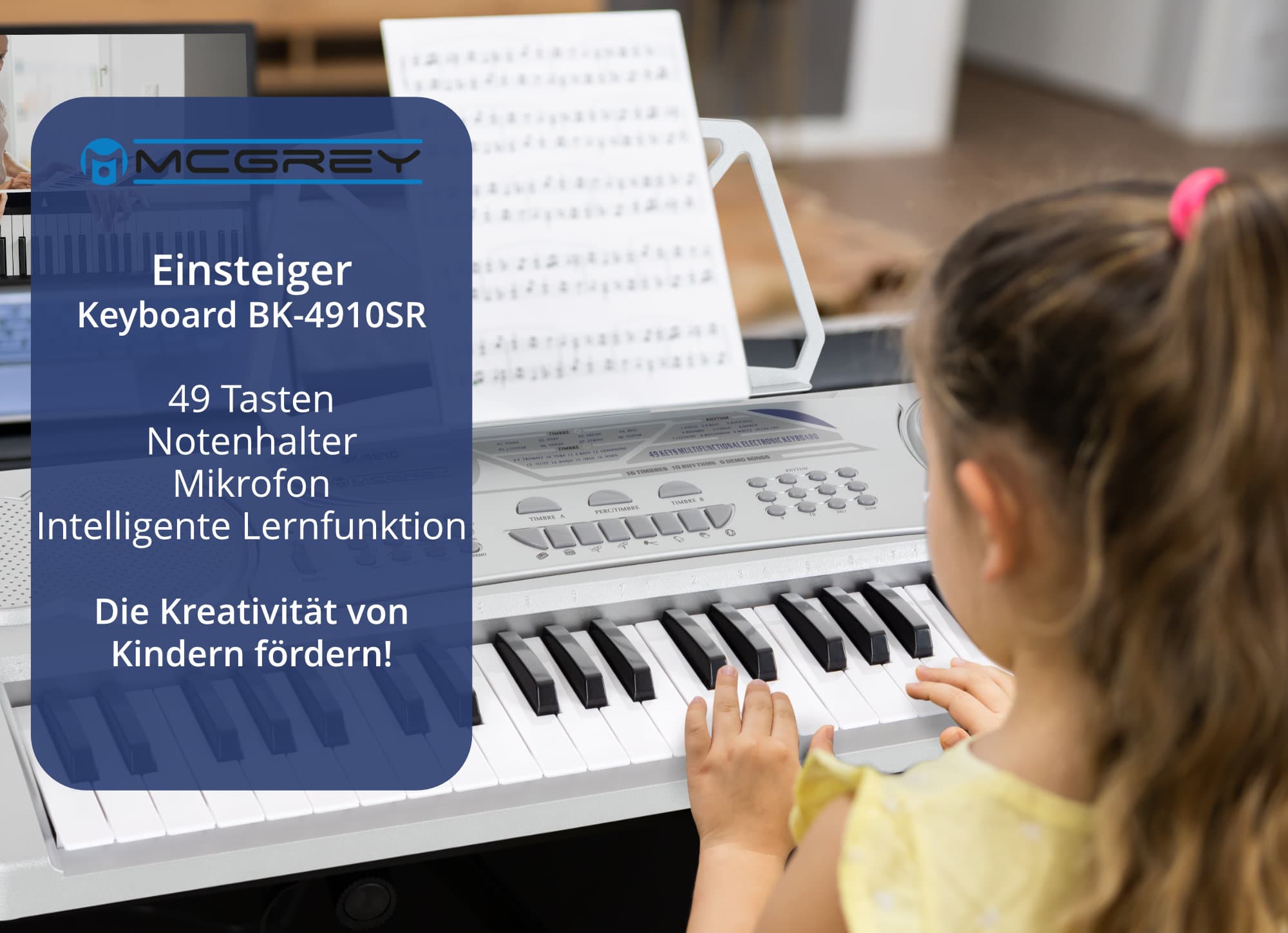 Das McGrey BK-4910 wurde bewusst für Keyboardneueinsteiger, welche einen Einstieg in die Welt der Musik suchen, entwickelt. Alle Funktionen und Tasten sind übersichtlich angeordnet, sodass sich selbst die Kleinsten von Anfang an spielend zurechtfinden.