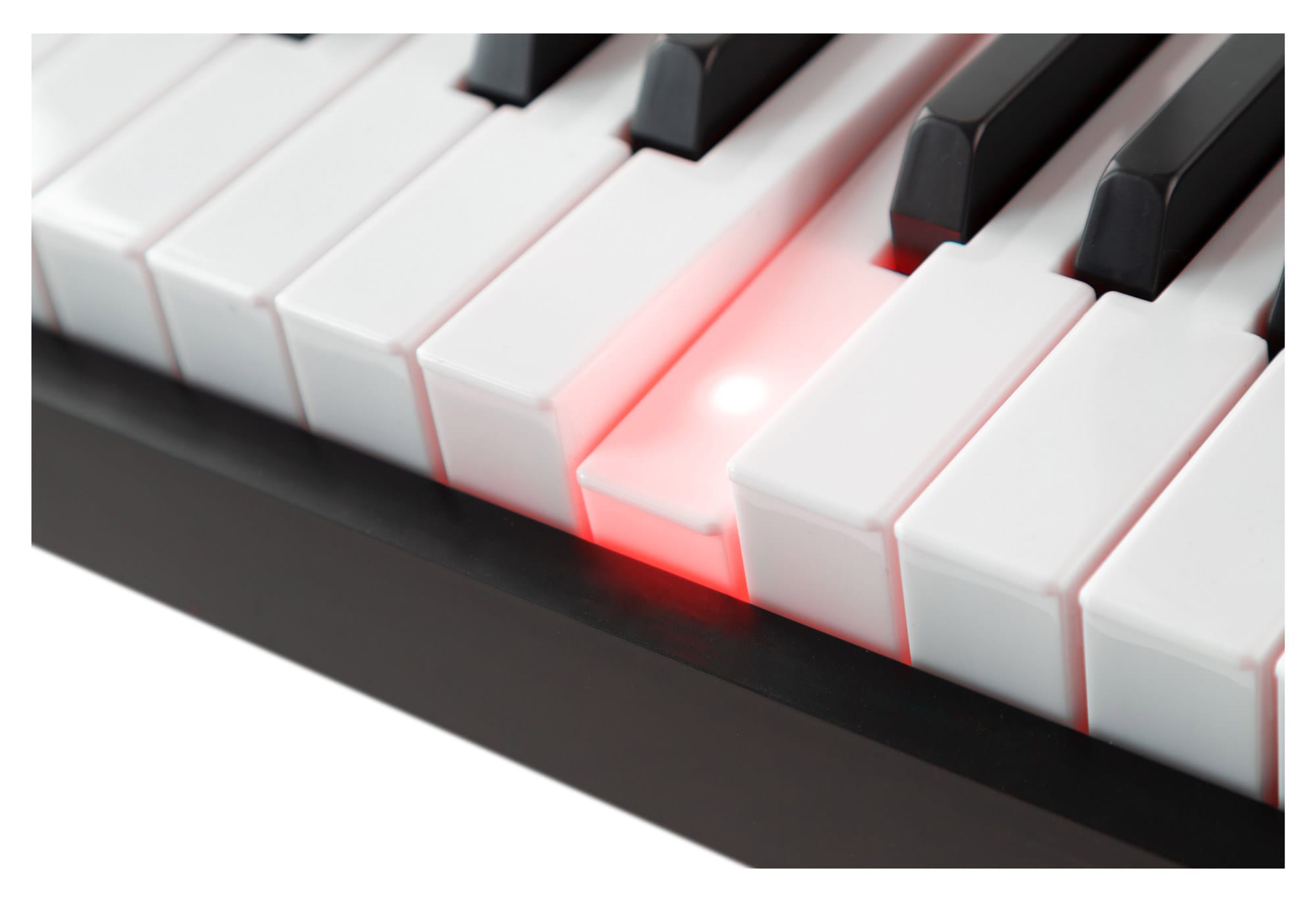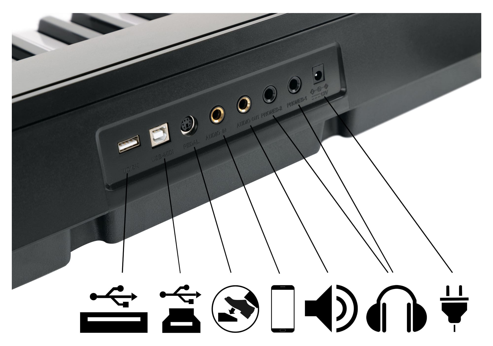 Für das Spielen zu den eigenen Lieblingssongs kann an der Klinkenbuchse ein Smartphone, Tablet oder sonstiger MP3-Player angeschlossen werden. Die abgespielte Musik wird direkt über die Lautsprecher wiedergegeben. An der Rückseite stehen zwei Kopfhörerausgänge zur Verfügung, für die Verbindung zu einem Computer ist ein USB-to-host-Port integriert. Die Leucht-LEDs in den Tasten regaieren sogar auf eingehende MIDI-Signale.