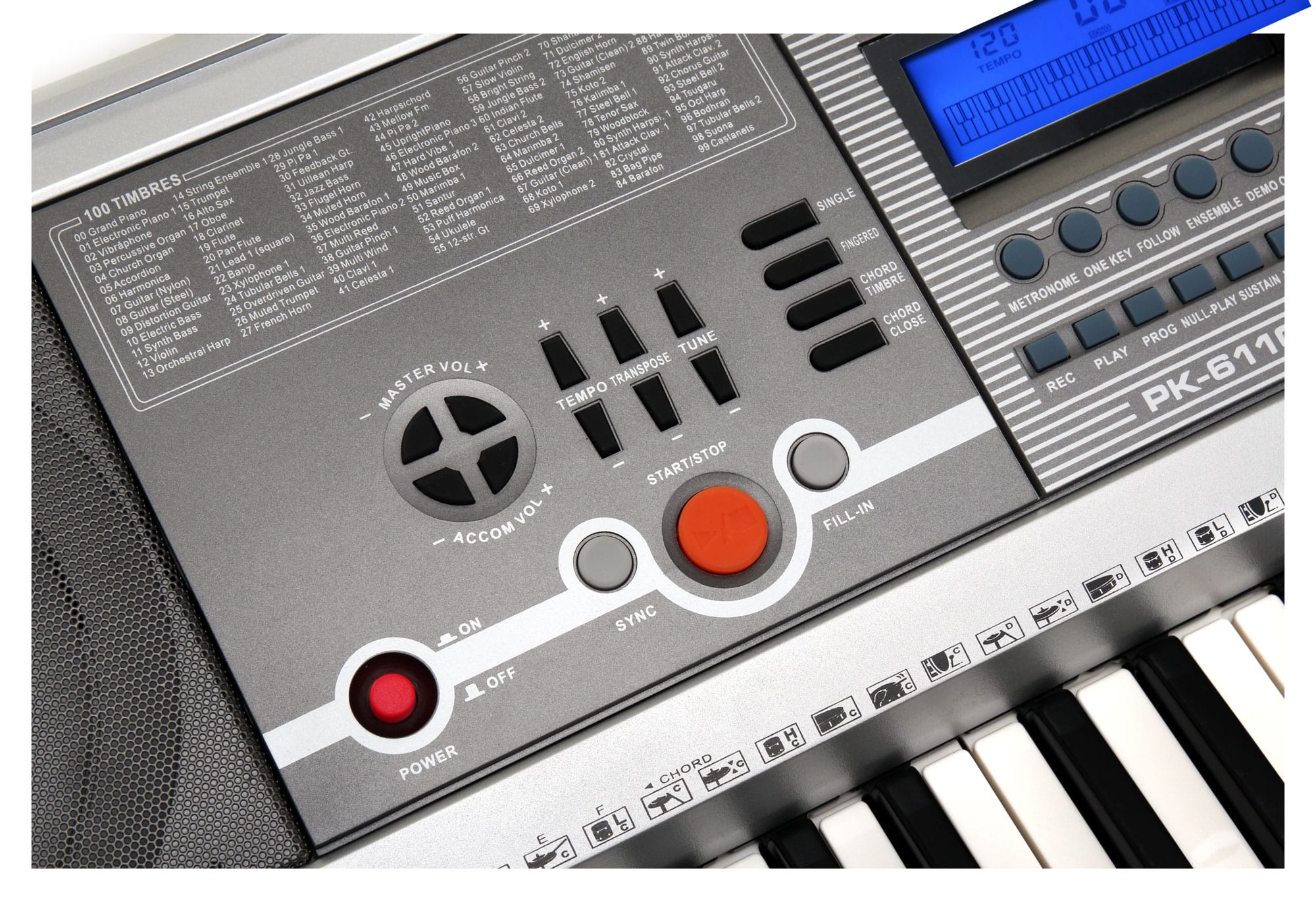 Mit 100 Sounds bietet das PK-6110USB Piano eine reichhaltige Auswahl von Klängen, sodass der Spielspaß nie vergeht. Enthalten sind natürlich der klassische Pianoklang, aber auch Instrumente wie Saxophon, Violine und viele mehr sind mit an Bord.