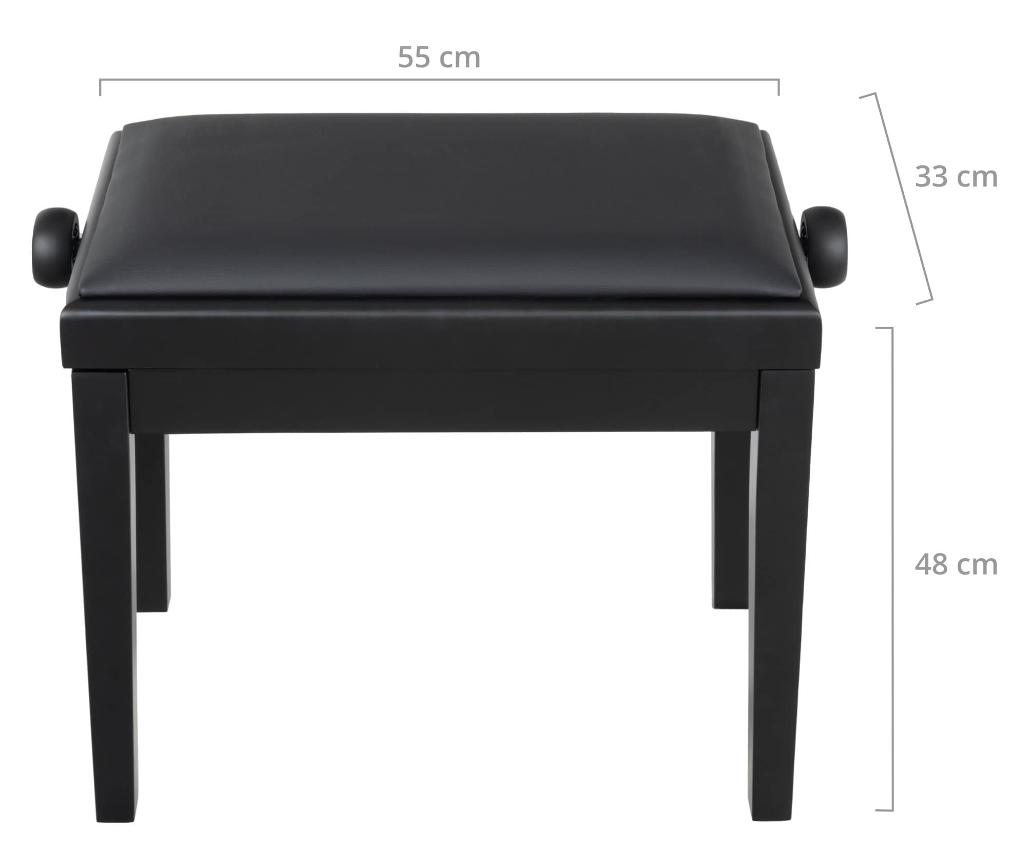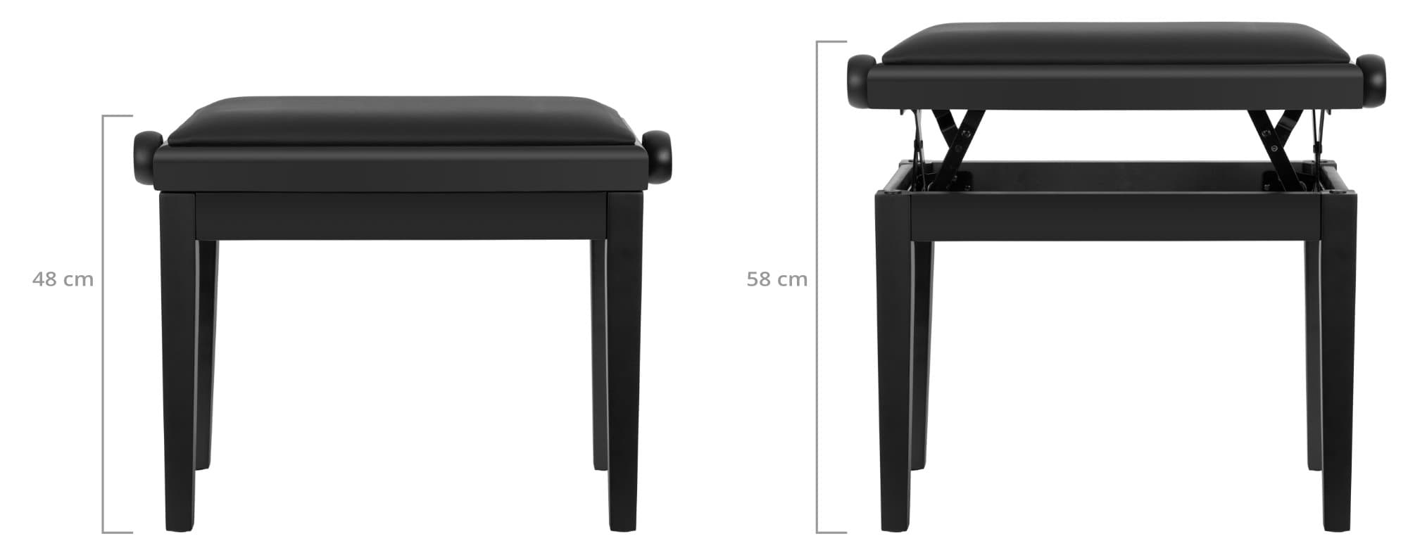 Die stabile Verbindung der Füße mit dem Rahmen und die präzise Hebemechanik heben diese schöne Pianobank deutlich von anderen Bänken dieser Preisklasse ab. Gummifüße an der Unterseite bewahren den Fußboden vor versehentlichen Kratzern.